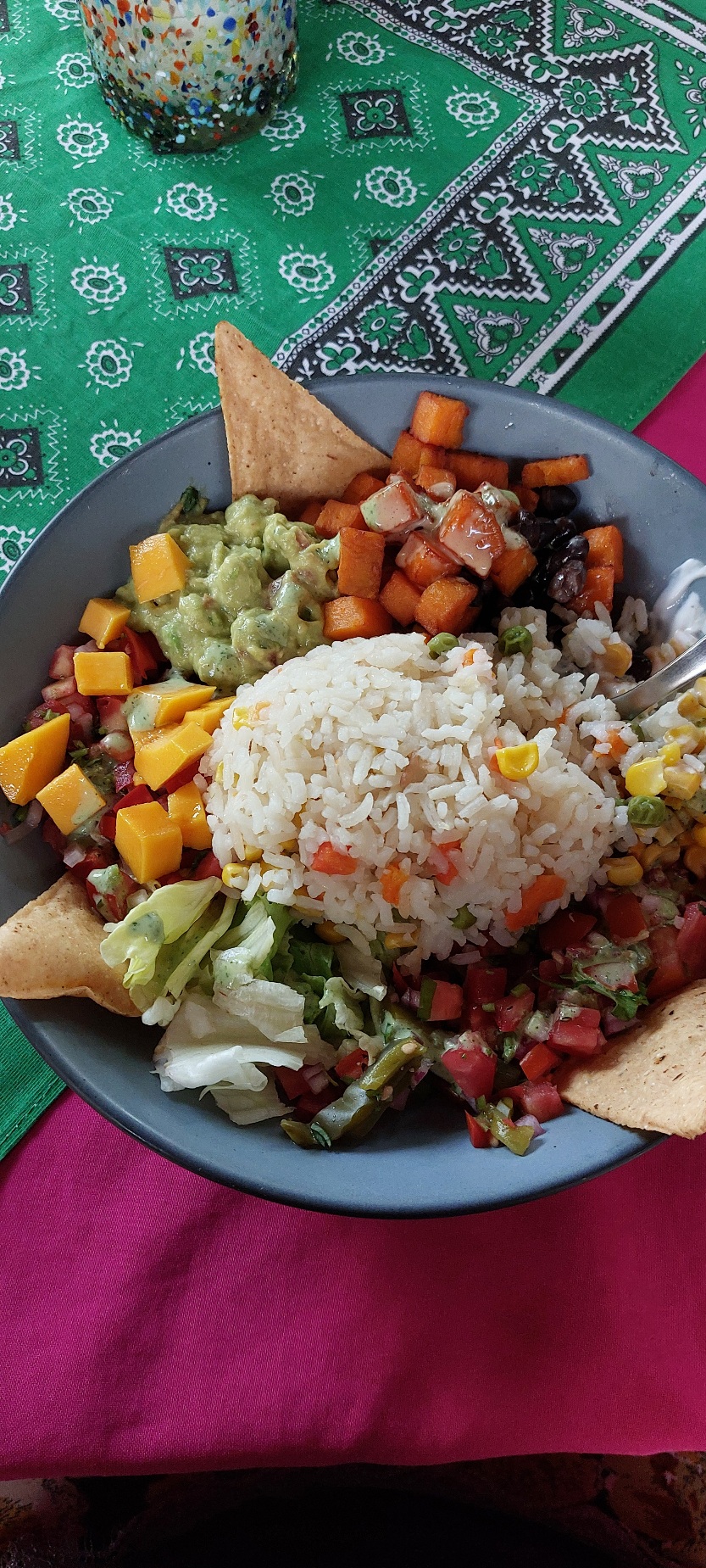 De Mexicaanse bowl zag er zalig uit, het was gelukkig niet al te warm in het restaurant, de temperaturen zijn in dit stadje zeker 6 graden hoger dan in Cancun. Vandaag was het 34 graden.