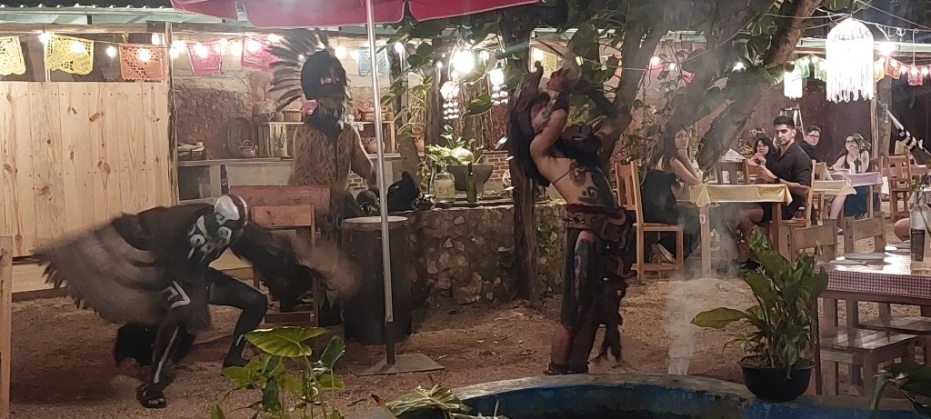 Om 8 uur was het weer tijd voor het avondeten, we gingen op zoek naar een gezellige buitenplek met live muziek, maar toen we net aan tafel schoven was de band gestopt en maakte deze plaats voor een show. Lila die eerst vrolijk rond rende door het restaurant was nu ineens erg rustig, ze was helemaal geïmponeerd door de Maya krijgers uit de show die op een schelp bliezen, rook maakte, schreeuwde en vuur gingen spugen. Ze vond het spannend maar ook erg leuk zagen we.