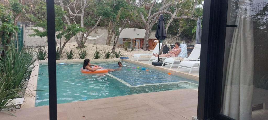 Toen we weer thuis kwamen en bij het zwembad gingen liggen herinnerde ik me opeens dat ik een beeldje gekocht had in Chichen Itza speciaal om neer te zetten in het Aluxes (elf achtige wezens uit de maya cultuur) huisje in de tuin van Pumbas. Aluxes worden beschouwd als beschermers van de jungle