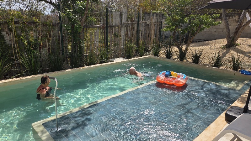 Gelukkig hebben we een zwembad met chloor dus ons maar even behelpen door een plons te nemen. Nu moest ook mijn vader eraan geloven.