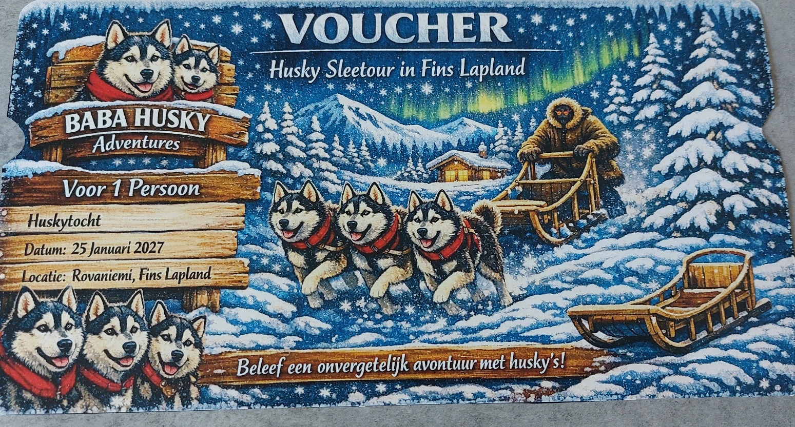 Namens iedereen die aanwezig was kreeg ik ook een prachtige cadeau, vliegtickets naar Lapland incl 3 overnachtingen in een echt Fins huisje met prive sauna en ook nog een husky sleetocht tocht voor 1 persoon.
