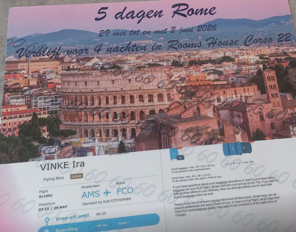 Elvira overhangde me zonder al te veel aandacht te vragen een grote envelop. Spannend wat zou daar in zitten. Het was een cadeau voor zowel mijn als Lesley zijn verjaardag. Vliegtickets voor een lang weekend naar Rome met ook nog eens een openbaar vervoer pas in Rome erbij incl 2 beziens waardigheden.