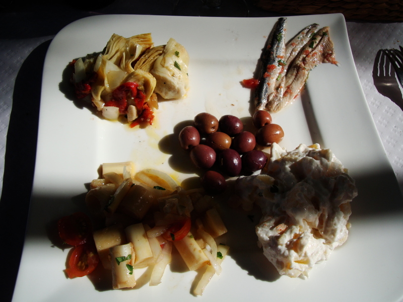 We reden weer terug naar Zahara, dit dorp is uitgeroepn tot nationaal monument, waar we gingen lunchen bij Al-Lago Een restaurant wat onderin het dorp ligt met een prachtig uitzicht op het meer, echt een schitterend plekje.  Ik had als voorgerecht verschillende koude tapas. Artisjokken, aardappelsalade, olijven, en ansjovis in het zuur en mijn man had kippesoep met mint.
