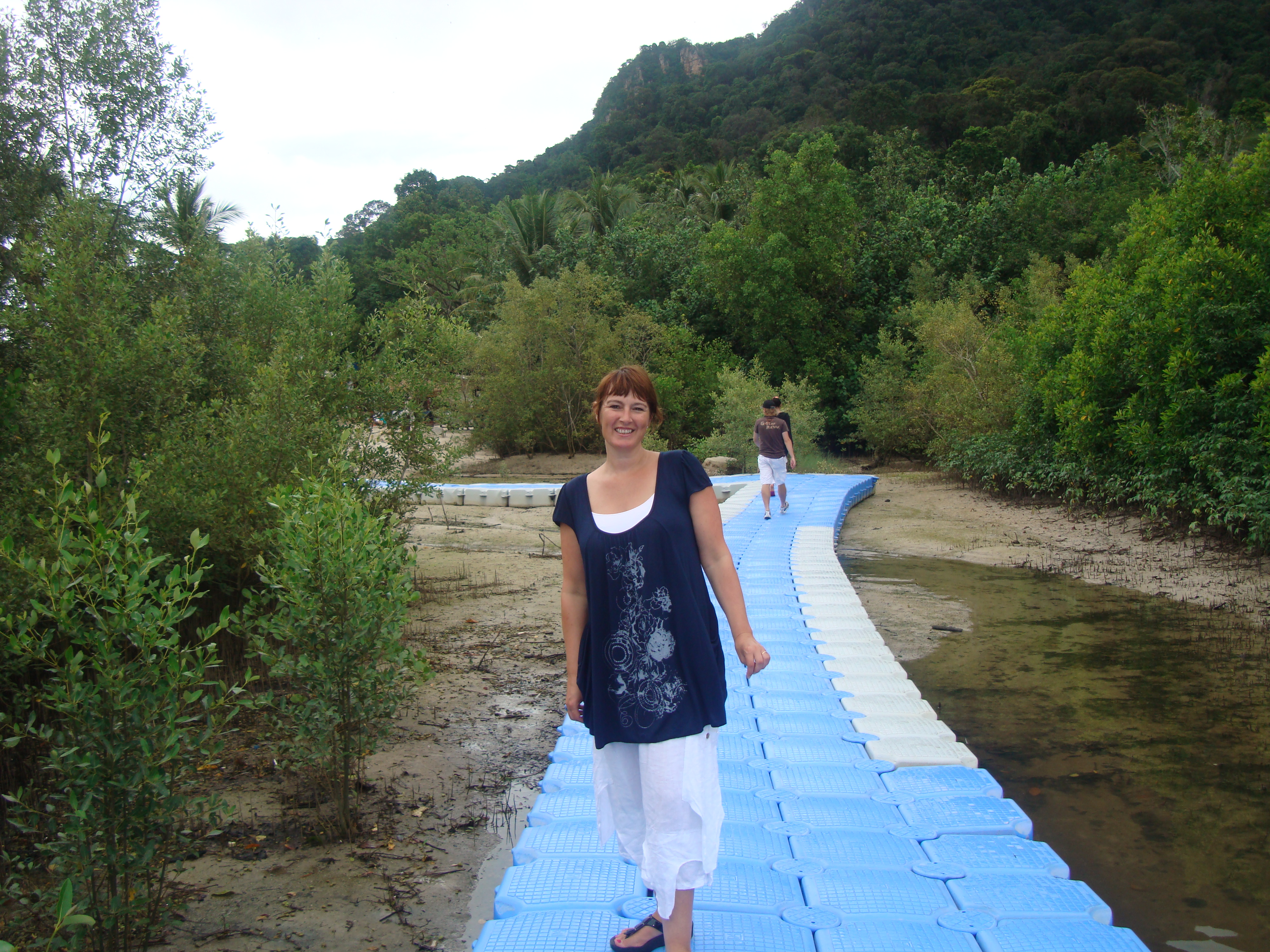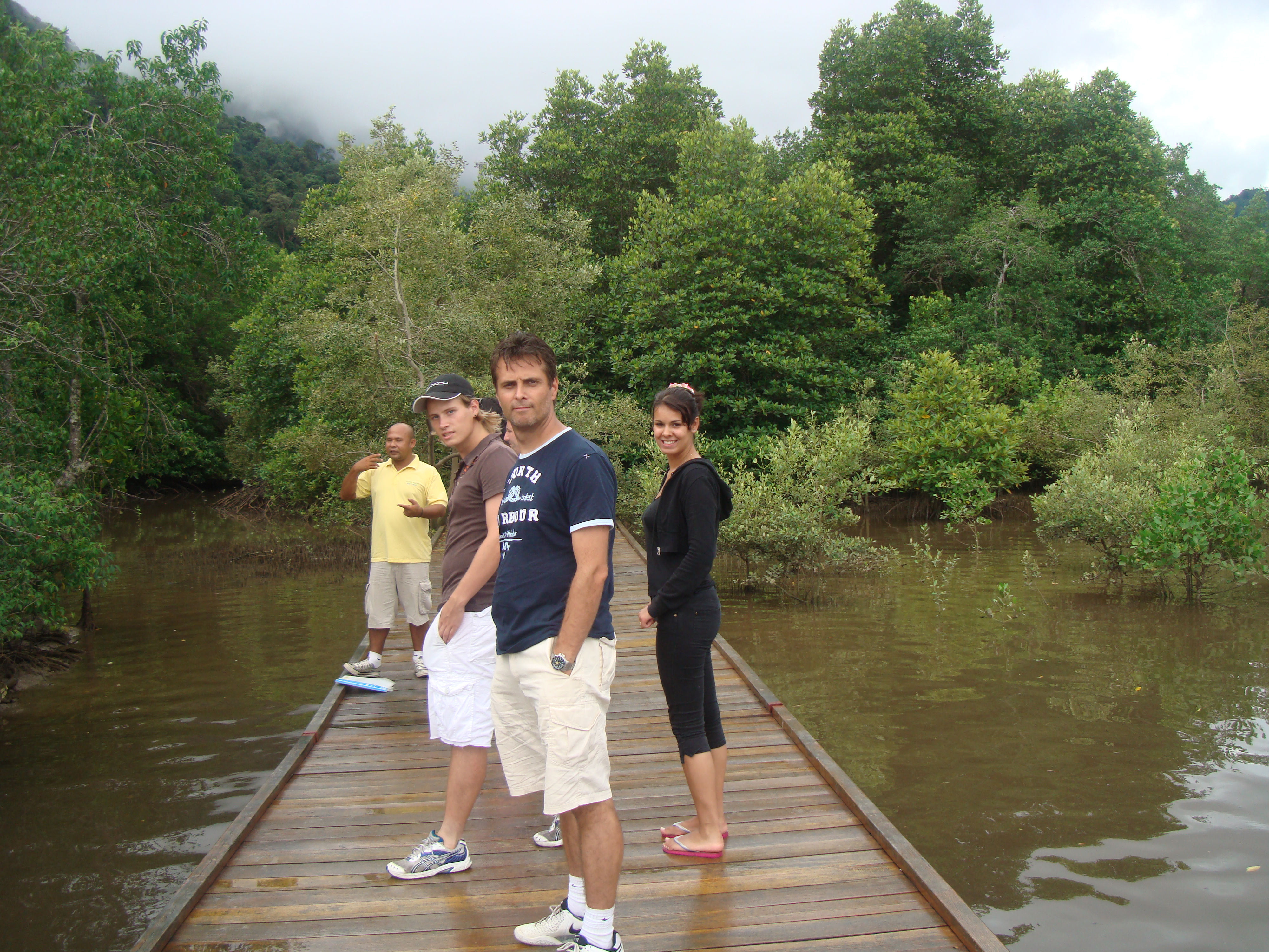 Met een klein groepje mede gasten uit Singapore, Italixc3xab, Tunesixc3xab en een tourgide liepen we over een speciaal voor deze tour gemaakte plastic vlonder. Het is er drassig, een beetje moerasachtig en om de mensen toch even wat verder het gebied in te laten gaan vertrokken we over die vlonder de mangrove in. Eigenlijk was het maar een kort stukje maar de gids vertelde ons wel veel over de natuur en de dieren die daar wonen. Veel hadden we al gehoord op onze grote mangrove tour een paar dagen geleden dus nieuw was het niet helemaal voor ons.