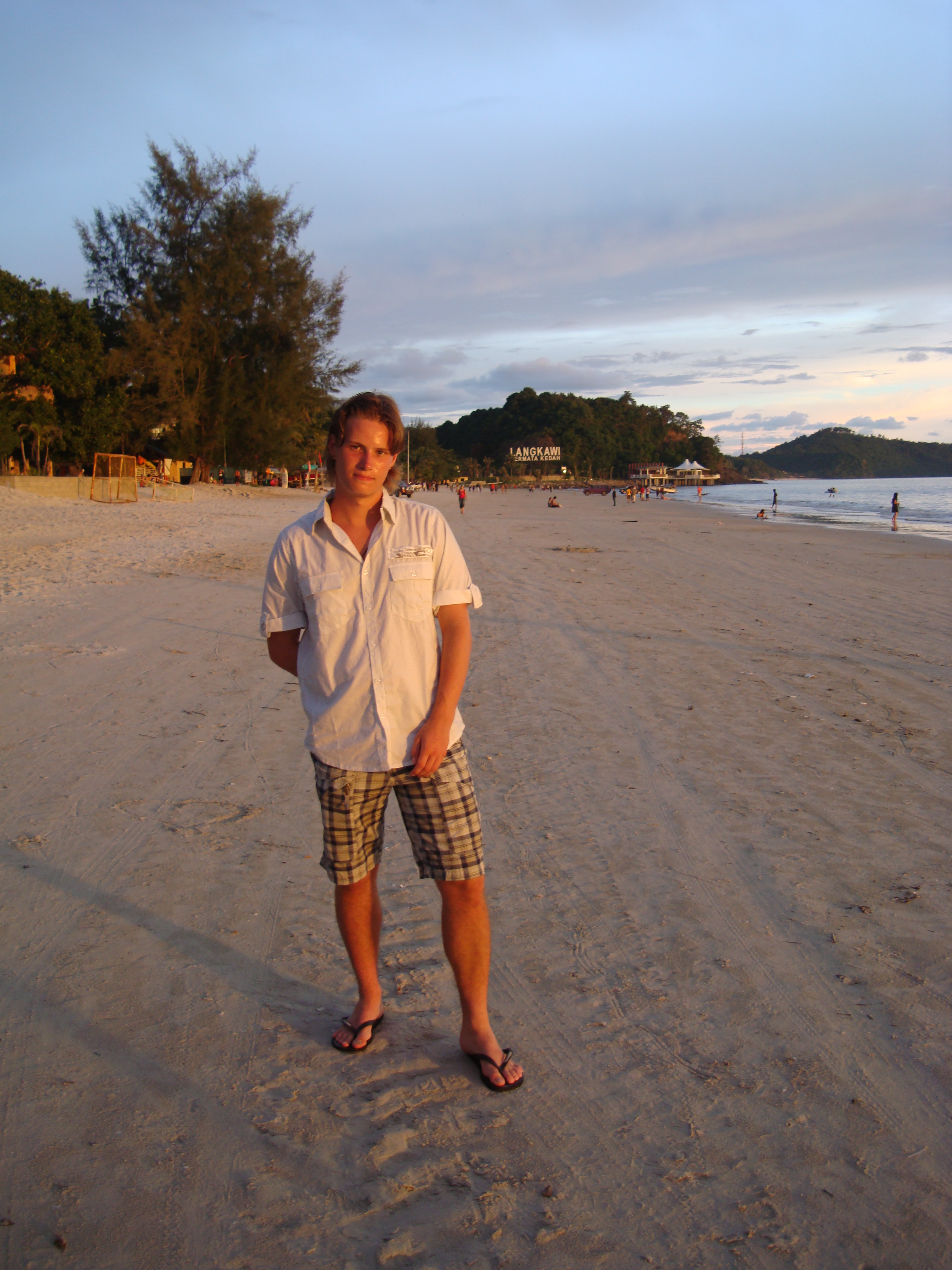 De stranden bij Cenang beach zijn prachtig wit en de zee is mooi blauw en het was nog licht, er hing een mooie gloed in de lucht, we zagen het zo donker worden.