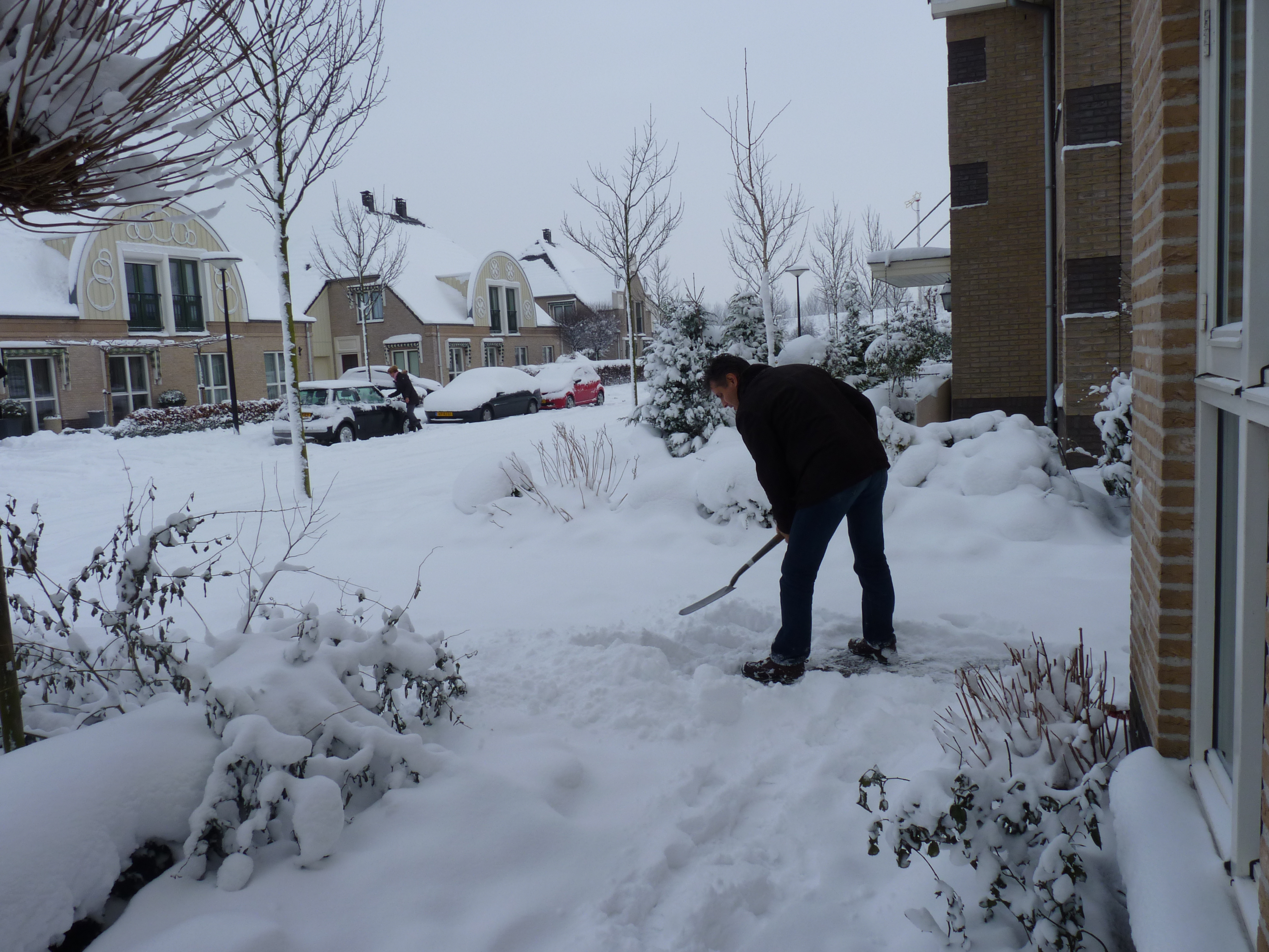 Zijn paps was aan het sneeuwruimen om ons koekblikje wat makkelijker van het pad af te laten rijden. Ik kan het niet vaak genoeg zeggen, ik ben zo blij dat hij donderdag thuis is gekomen ipv vrijdag, want anders had hij vast en zeker onderweg ergens op een veltbedje op de luchthaven moeten slapen want al het vliegverkeer had last van het weer.