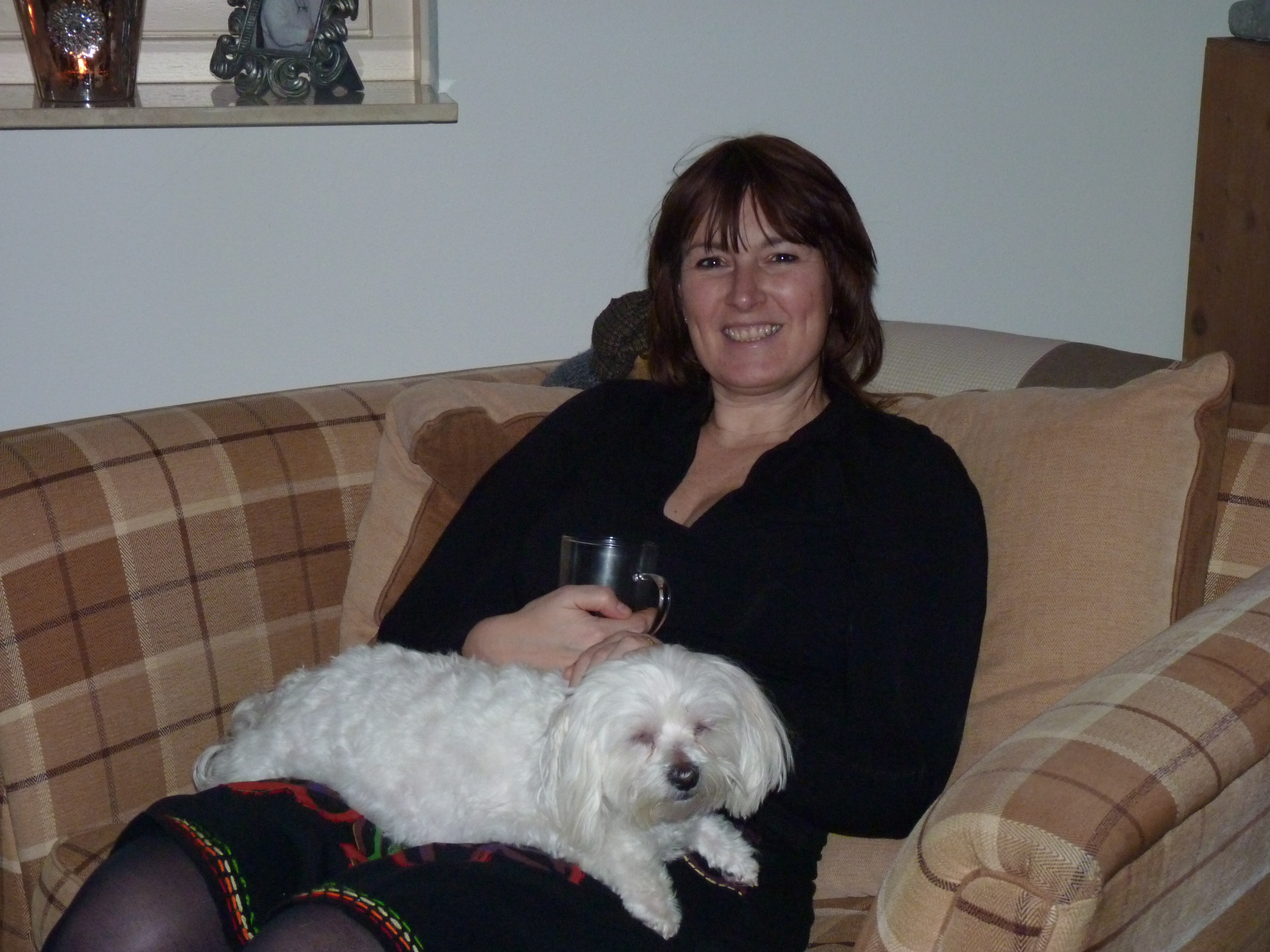 Moppie het hondje van mijn schoonzus lag moe en voldaan heerlijk op mijn schoot te slapen.