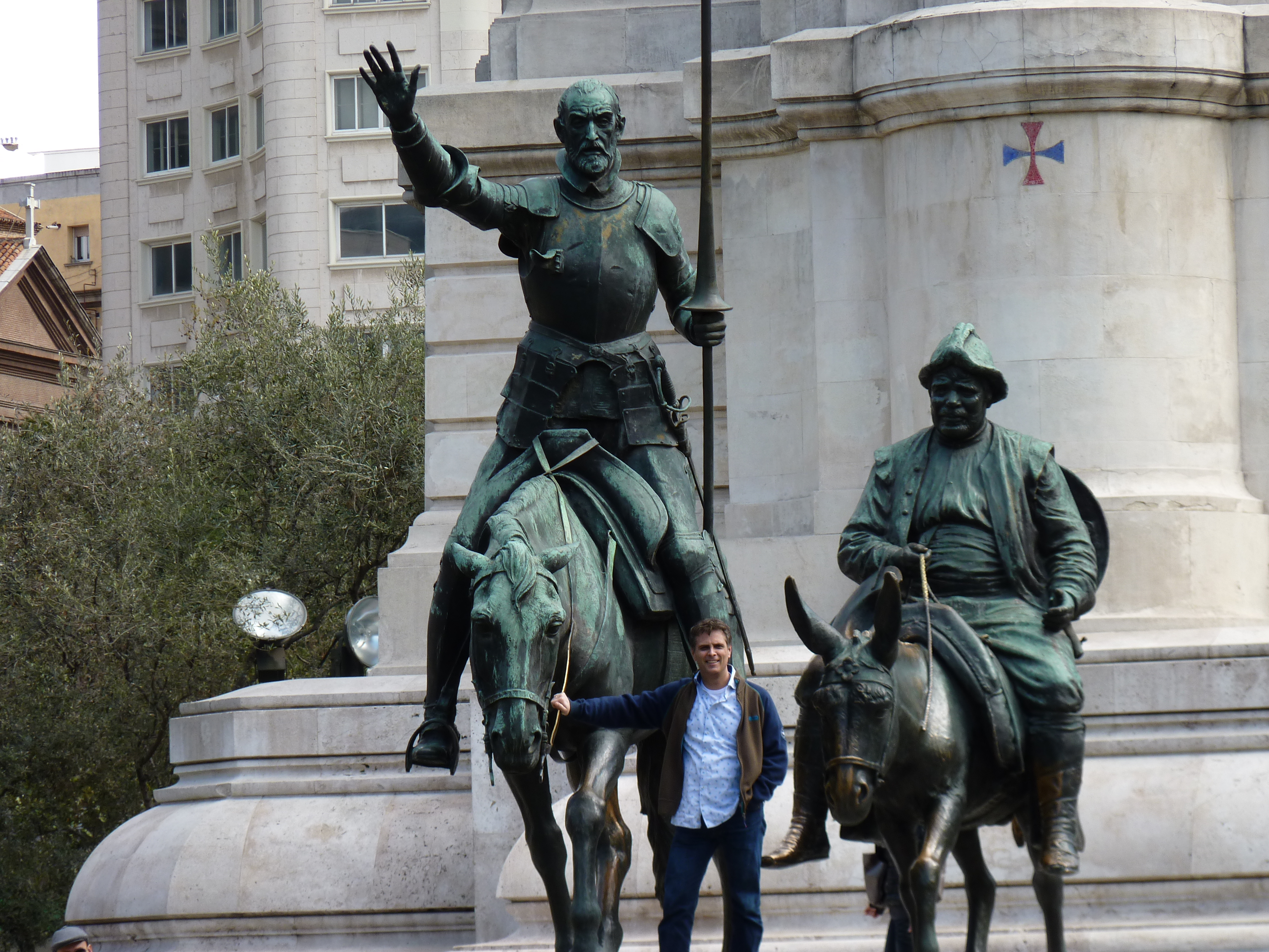 We liepen naar het grote plein Plaza Espana, daar vind je een groot beeld van Don Quijote en Sancho Panza. Lesley wilde natuurlijk met deze grootheden op de foto.