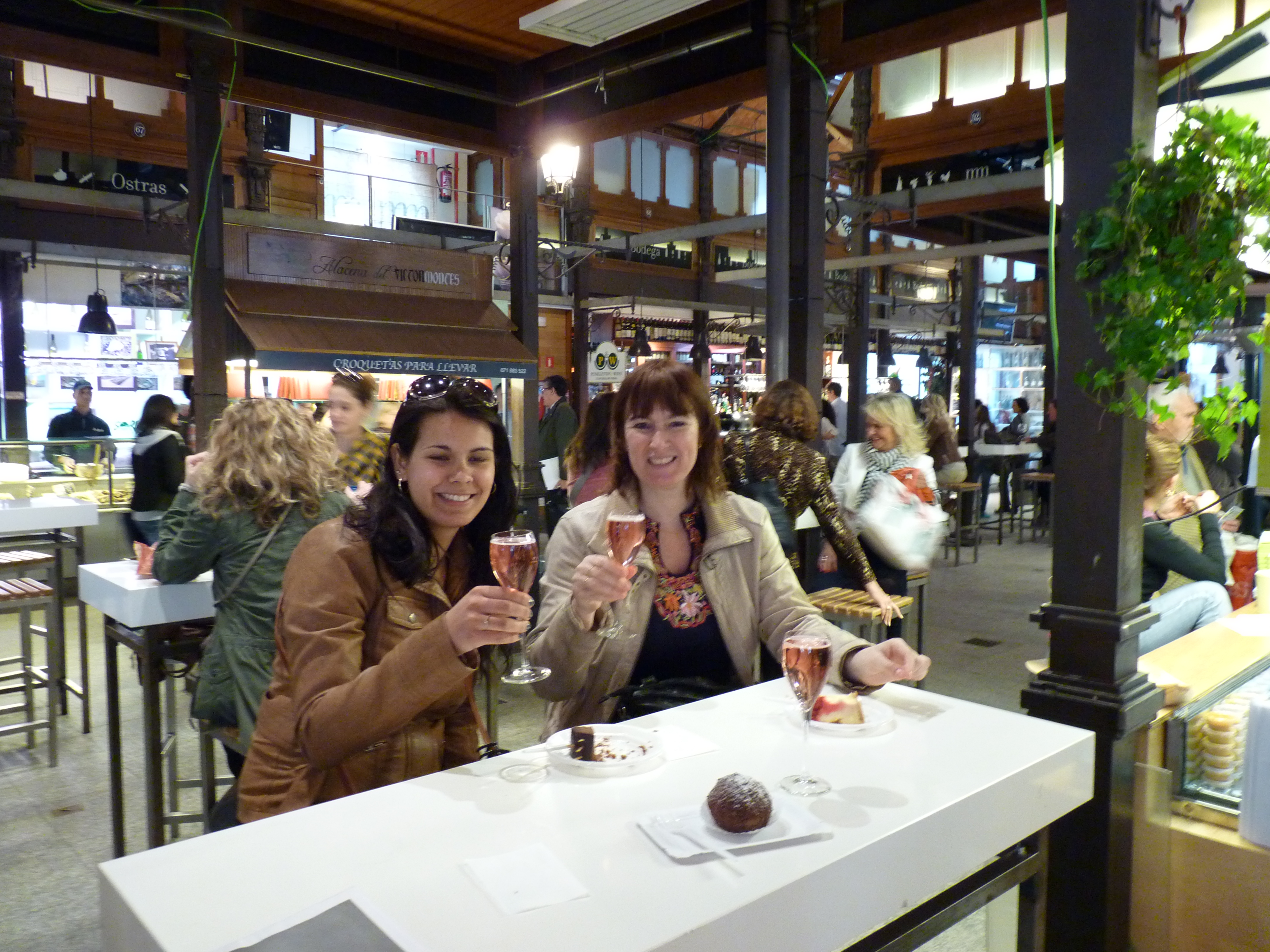 Toen zijn we terug gegaan met de metro naar Plaza Espana en daarvandaan zijn we gelopen naar Mercado San Miquel waar ik getrakteerd werd op een taartje met een glas rosxc3xa9 cava. Ik voelde me echt jarig.