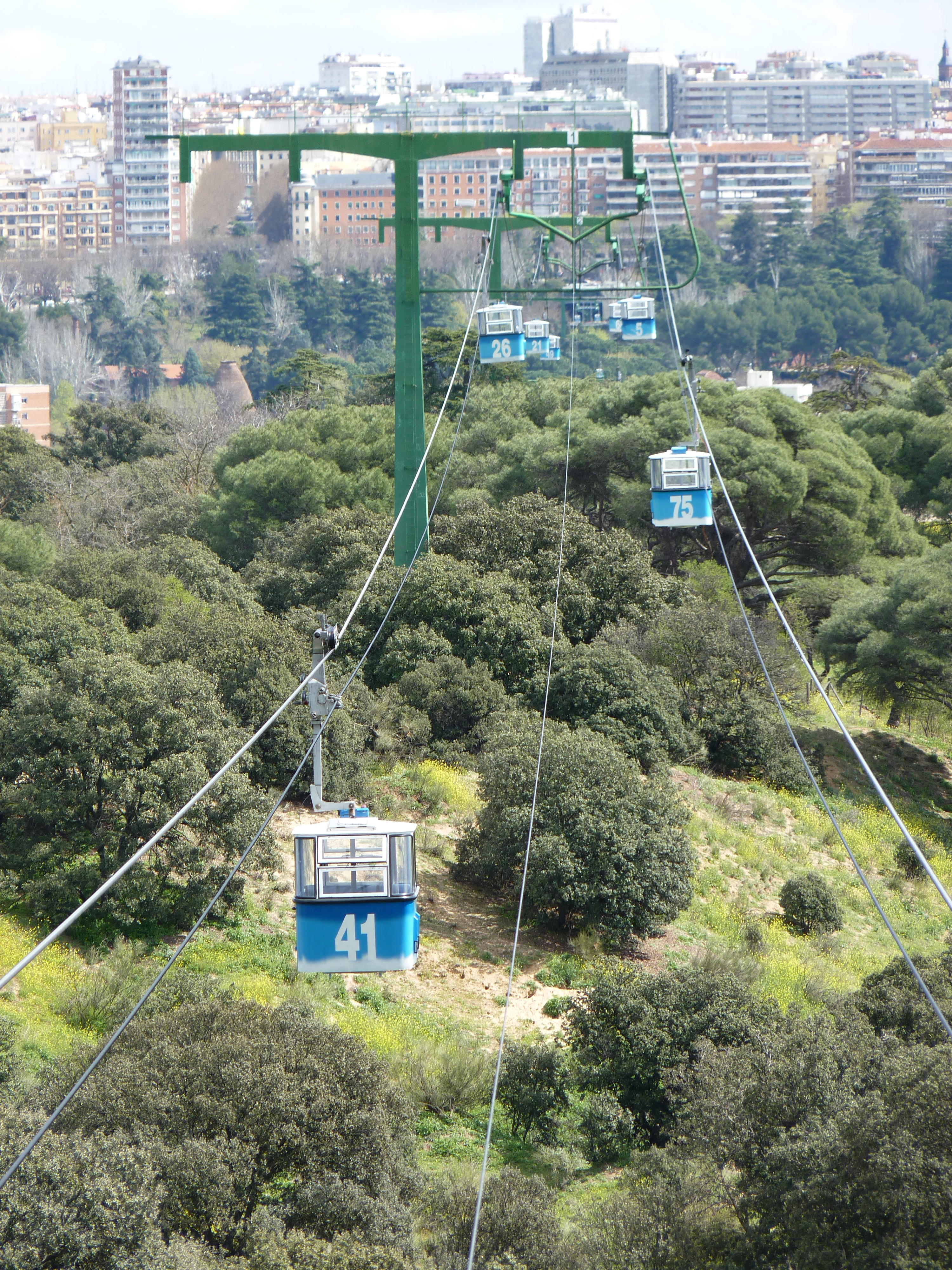 We liepen langs plaza Espana naar parque de la Montana en Parque del Oeste waar vandaan een kabelbaantje vertrekt, Teleferico Casa de Campo brengt je in zo'n 10 minuten hoog in de lucht naar een groot park ten westen van de stad, leuk om een deel van Madrid ook van die hoogte te bekijken.