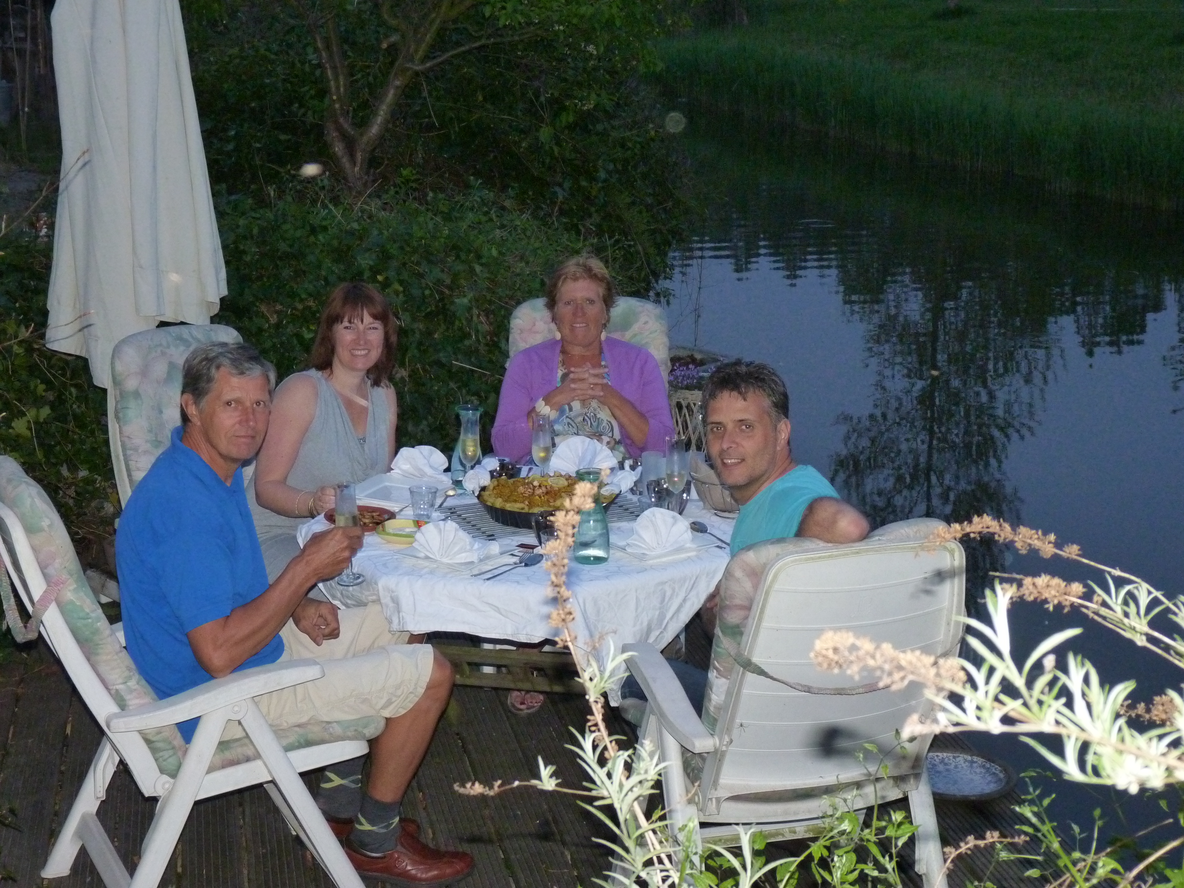Wij wonen hier nu 9 jaar en we hebben sinds 8 jaar een eetavondje met onze buren. Om de 3 a 4 maanden gaan we voor elkaar koken maar in al die jaren hebben we nog nooit buiten kunnen eten tijdens onze geplande afspraak. Daarom vonden wij het dan ook heel bijzonder dat we gisteravond tot laat buiten in de tuin op ons terras aan het water hebben kunnen eten.