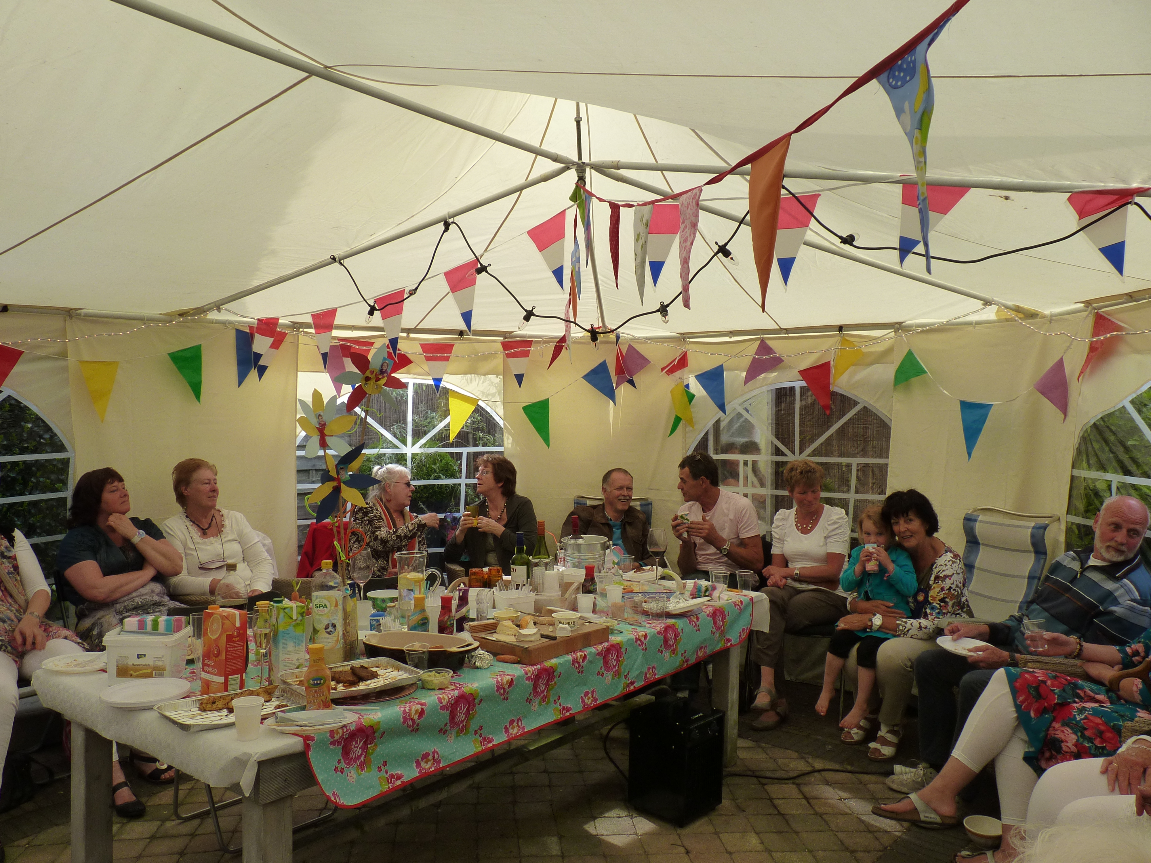 Daarom werd de partytent opgezet in de tuin en de familie was welkom, een taartje, een drankje en later de barbeque. Het was supergezellig. P1020490