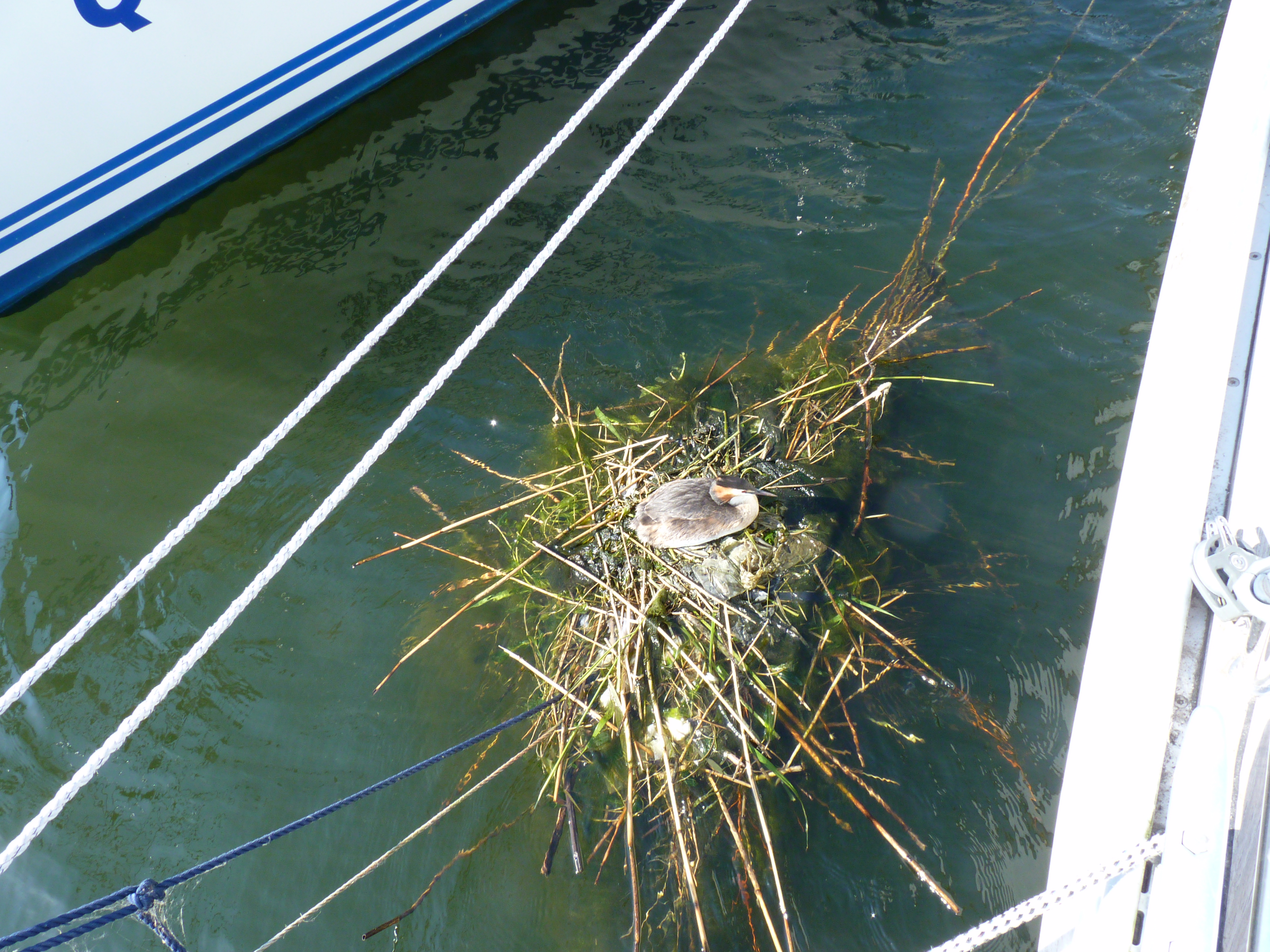 Toen we weer terug waren in de haven zagen we een fuut druk aan het broeden op haar prachtige nest, gemaakt door haar ijverige mannetje.