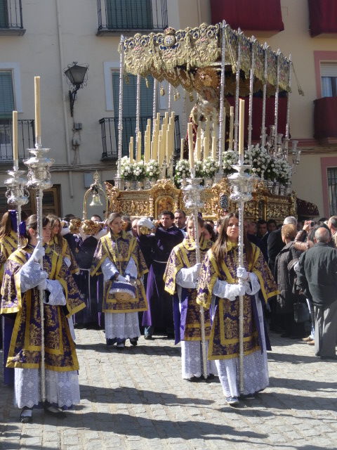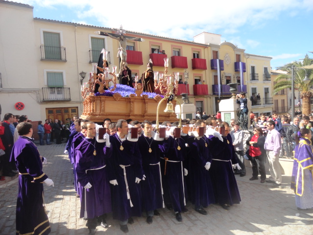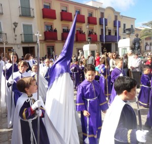Het is Semana Santa in Spanje, de week van de paasvieringen, de donderdag en vooral de vrijdag (goede vrijdag) zijn de meest belangrijke dagen, het land is in feeststemming en als je niet mee loopt in de processie dan sta je wel langs de kant te kijken naar vrienden of familieleden die dat wel doen en natuurlijk heb je nog de vele toeristen uit verschillende landen die af komen op de voor ons bijzondere optochten. Ik ga al een aantal jaar naar Spanje maar nog nooit was ik er met Pasen geweest, ik wilde ontzettend graag eens zo’n optocht meemaken. Samen met Ibolja ging ik vrijdagochtend rond 11 uur naar Archidona. De mannen gingen verder met de muur af te bikken, terwijl de dames het grote volksfeest gingen meebeleven, goed verdeeld hé. Het was enorm fascinerend om te zien, kinderen, militairen, oude mannen, jonge mannen, oude vrouwen jonge vrouwen allen verkleed in bijzondere kostuums, er werd gezongen, muziek gespeeld, met kaarsen, met bloemen en met wierook gewapperd.