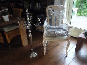 Op het moment ben ik er helemaal druk mee, ik snuffel overal even binnen om ideeën op te doen. Zo kwam ik laatst met mijn vriendin Lida bij de kringloop winkel en zag een leuk stoeltje staan, zoiets had ik voor x80150 bij de woonexpress zien staan, na een vriendelijk woordje tegen de verkoper heb ik de stoel nog kunnen afdingen van x8020 naar x806,50. Ik krab hem af doe er een nieuw stofje op en hij zal superleuk in mijn Spaanse huis staan. Ook zag ik bij de woonexpress, wat op zich al niet zo’n dure winkel is, een mooie zilveren kandelaar staan voor x8090, na even goed zoeken heb ik hem ergens anders voor x8040 kunnen kopen, kijk dat vind ik nu leuk.