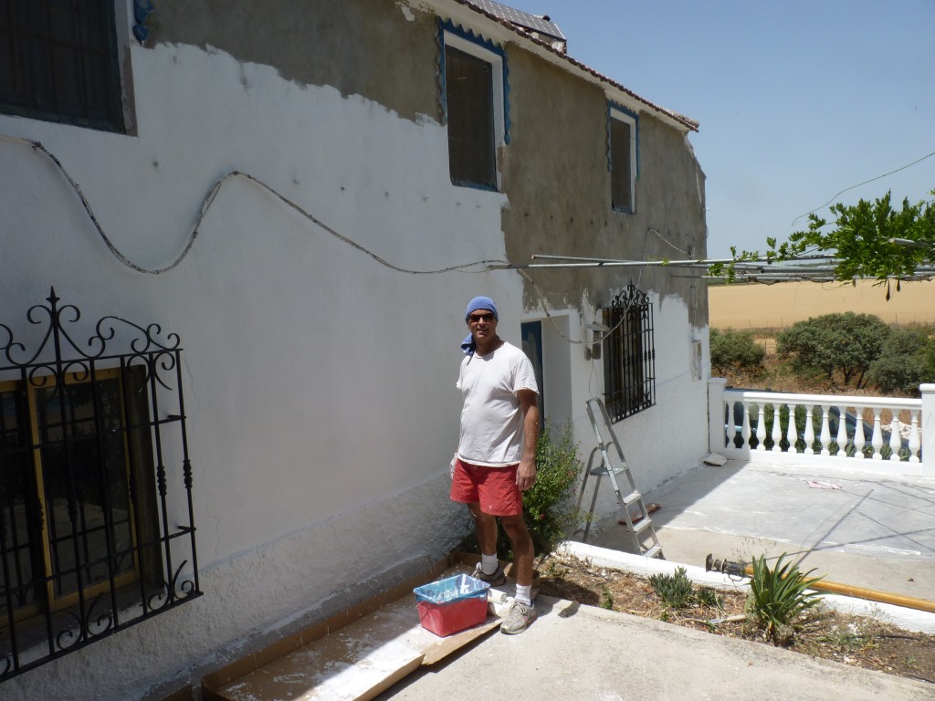 Lesley ging de bovenkant van het huis vanaf de ladder verven, Cheyenne het hek aan de voorkant van het huis, ik de muurtjes van het zwembad en Jairo ging nog een karretje afval inladen en verder met het afbikken van de zijmuur.