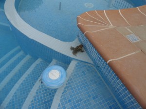 De man was nog geen half uur bezig of hij raakte al een waterleiding en het water spoot met volle kracht omhoog. Ook dat nog, na de lunch zou hij het gaan maken, we moesten voor nu maar de hoofd kraan dicht draaien. Met het gevolg dat we geen stromend water hadden voor een paar uur. Gelukkig wel nog een zwembad. Toen we erin wilde duiken zagen we dat er een klein vriendje in zat, hij vond het heerlijk in dat schone bad.