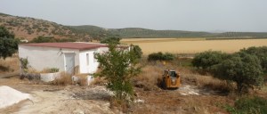Een beetje de grond vlak maken rondom het huis was zijn opdracht, er staat een onkruid en er ligt een troep onder de stekelbosjes.