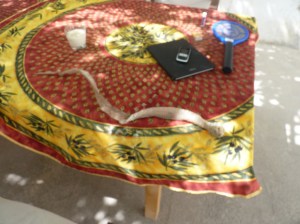 Je maakt nog eens wat mee in de campo, je zit midden in de natuur, het is 2 jaar hun domein geweest en nu wonen er ineens van die vervelende mensen. Toen ik wat onkruid uit de tuin aan het weg halen was vond ik een slangen huid, ehh best wel eng eigenlijk.