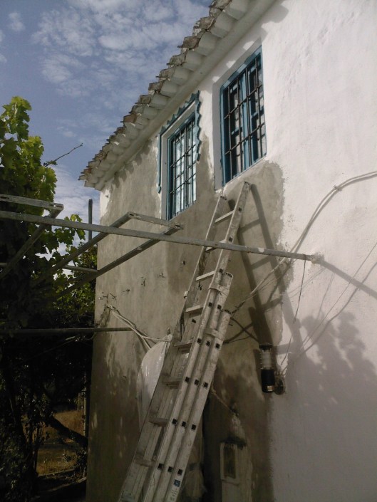 De voorkant van ons huis is nu helemaal gestuct en aan de zijkant is hij ook begonnen.