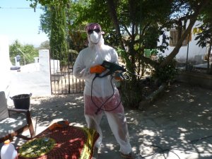 Aan de overkant van de tegelhandel zit een olijffabriek en daar kan je een soort super onkruidverdelger kopen had ik me laten vertellen, de boeren spuiten dat tussen hun olijfboomgaarden om het onkruid weg te houden, dat wilde wij natuurlijk ook hebben. Alleen spuiten als de planten groen worden vertelde het mannetje nadrukkelijk niet als ze geel zijn want dan helpt het niet.