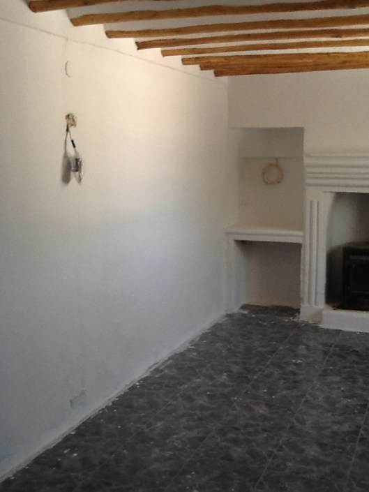 Rob was de zijmuur aan het stucen, Lesley zelf heeft de binnenmuur helemaal afgeverfd en heeft daarna de houtkachel naar buiten getild om hem weer opnieuw zwart te spuiten.