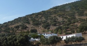 De oude boerenwoning is gelegen in het gebergte del Pedroso onderaan de voet van een grote berg, de buren zijn niet te zien.