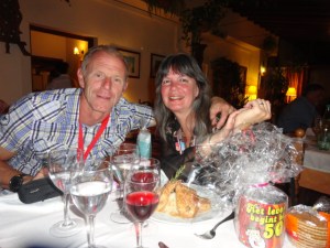 Na een heerlijk voor en hoofdgerecht uit de Spaans/Italiaanse keuken kwam er een taart uit de keuken met 50 erop en iedereen begon te zingen, het was een waar feestje en super gezellig.