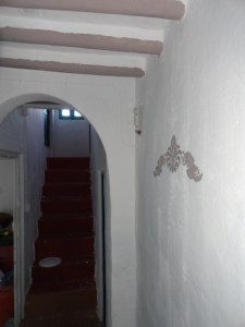 Mijn trappetje was aardig wit geworden, op de traptreden na die worden later met beton verf geverfd, de plafond balken had ik afgekrabd en een kleurtje gegeven en ik had een leuk sjabloon op de muur gemaakt.