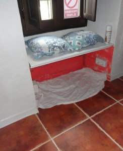 Het is geen weer voor buiten daarom ging ik binnen maar het stukje rood wat er nog op de keukenmuur zat, wit verven maar doordat de buitenmuur zo koud was droogde het maar slecht.