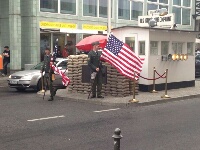 Checkpoint Charlie en ook gezien hebben we een enorme zuil met Victoria de godin van de overwinning bovenop, de gouden engel die uitkijkt over Tiergarten.