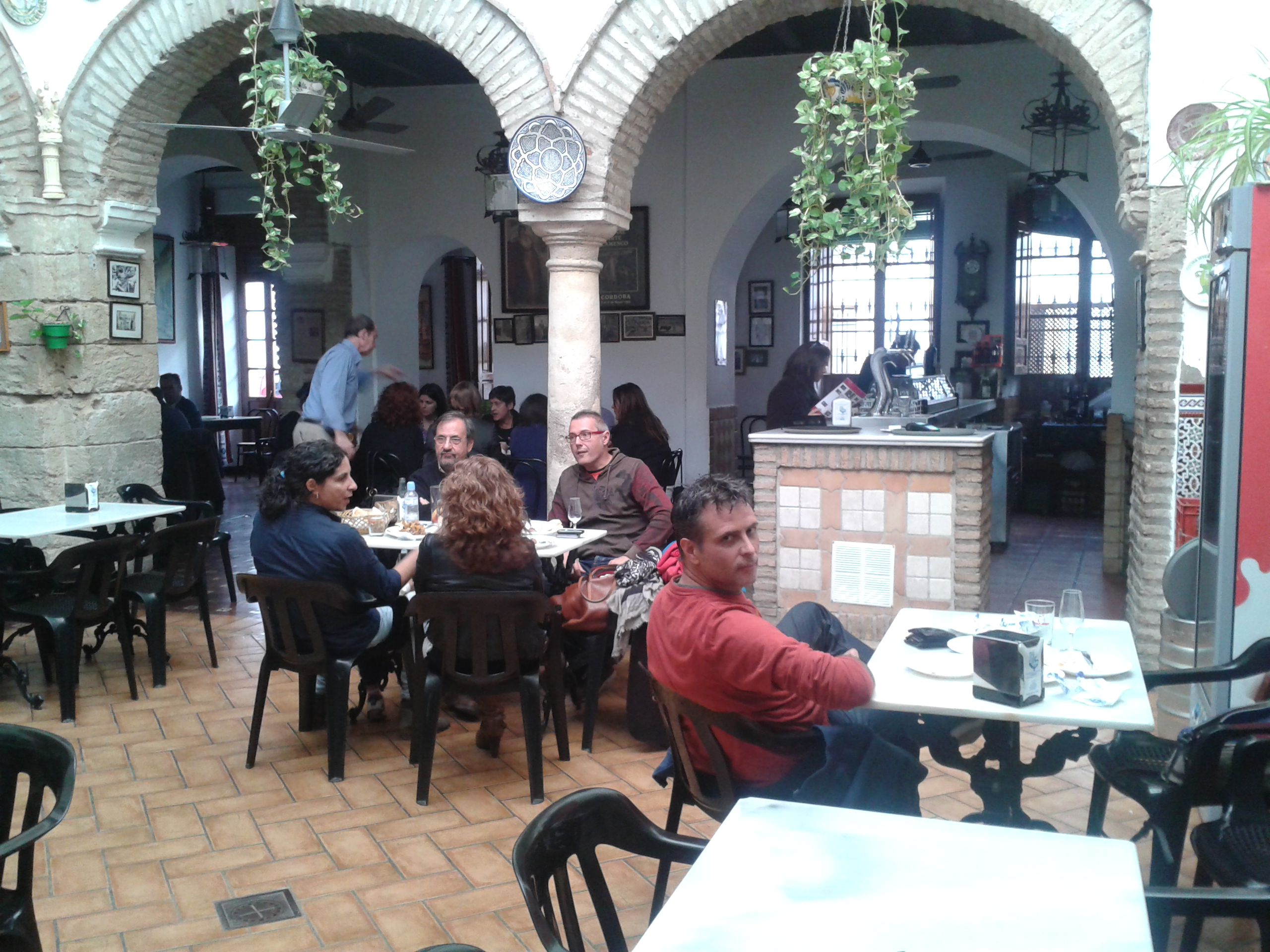 Aan de overkant lag het flamingo museum en dat is ook erg de moeite waard om te bezoeken. Je hoort de verschillende manieren van klappen, gitaarspelen en zang tevens zie je de verschillende soorten dans bewegingen, allemaal op de computer schermpjes met koptelefoons. Ondertussen was het alweer lunchtijd en in een heel klein straatje zagen we een echt Spaans restaurant, een soort overdekte binnentuin, we bleven maar om ons heen kijken, leuke bogen, plantjes en bordjes en heel belangrijk hele lekkere tapas.