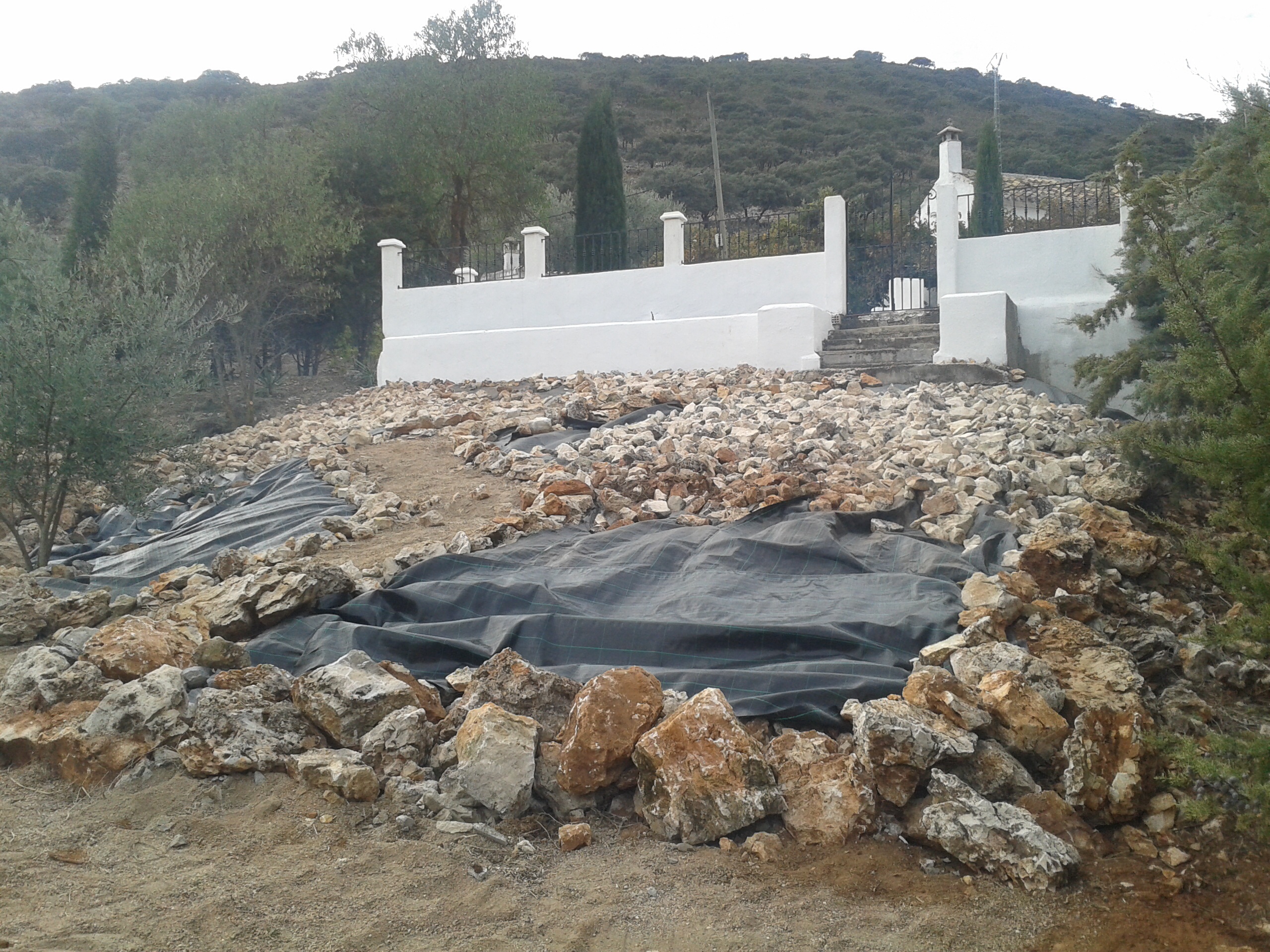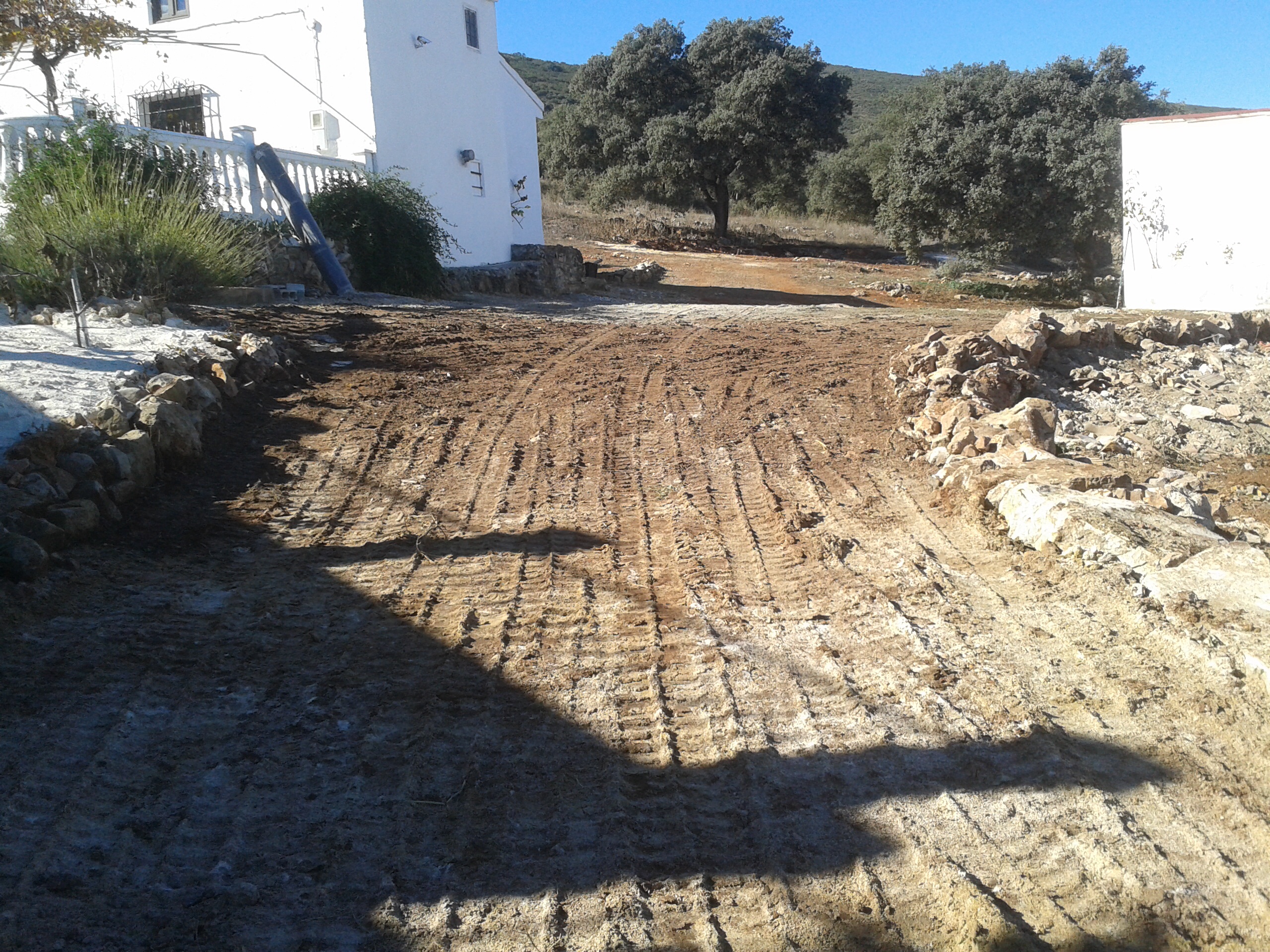 Toch is het plan wat ik in mijn hoofd had tijdens de werk en uitvoering al diverse keren gewijzigd, soms laat je wat omdat het niet kan of omdat het budget het niet toe laat en soms wordt het juist fraaier dan je van te voren dacht omdat je een goede ingeving krijgt hoe het nog leuker kan worden. We willen de tuin zo mooi mogelijk maken met zo min mogelijke centen. Ik bedacht me dat achter het zwembad een aantal oleanders staan, prachtige sterke planten, maar ze staan een beetje her en der verspreid en niet direct in het zicht, ik ga ze daar laten weghalen en voor het huis laten plaatsen. Hoop dat ze dat overleven want dan hebben we gelijk al wat leuke onderbrekingen staan tussen het grind, want ons plan is om zoveel mogelijk grind te laten storten, staat fraai en houd ook het onkruid redelijk tegen. Op de stukken waar we niet met de auto overheen rijden komt er wel landbouwplastic te liggen en onder het rijgedeelte niet, natuurlijk zullen we af en toe wel moeten spuiten met onkruidverdelger maar dat is te overzien.