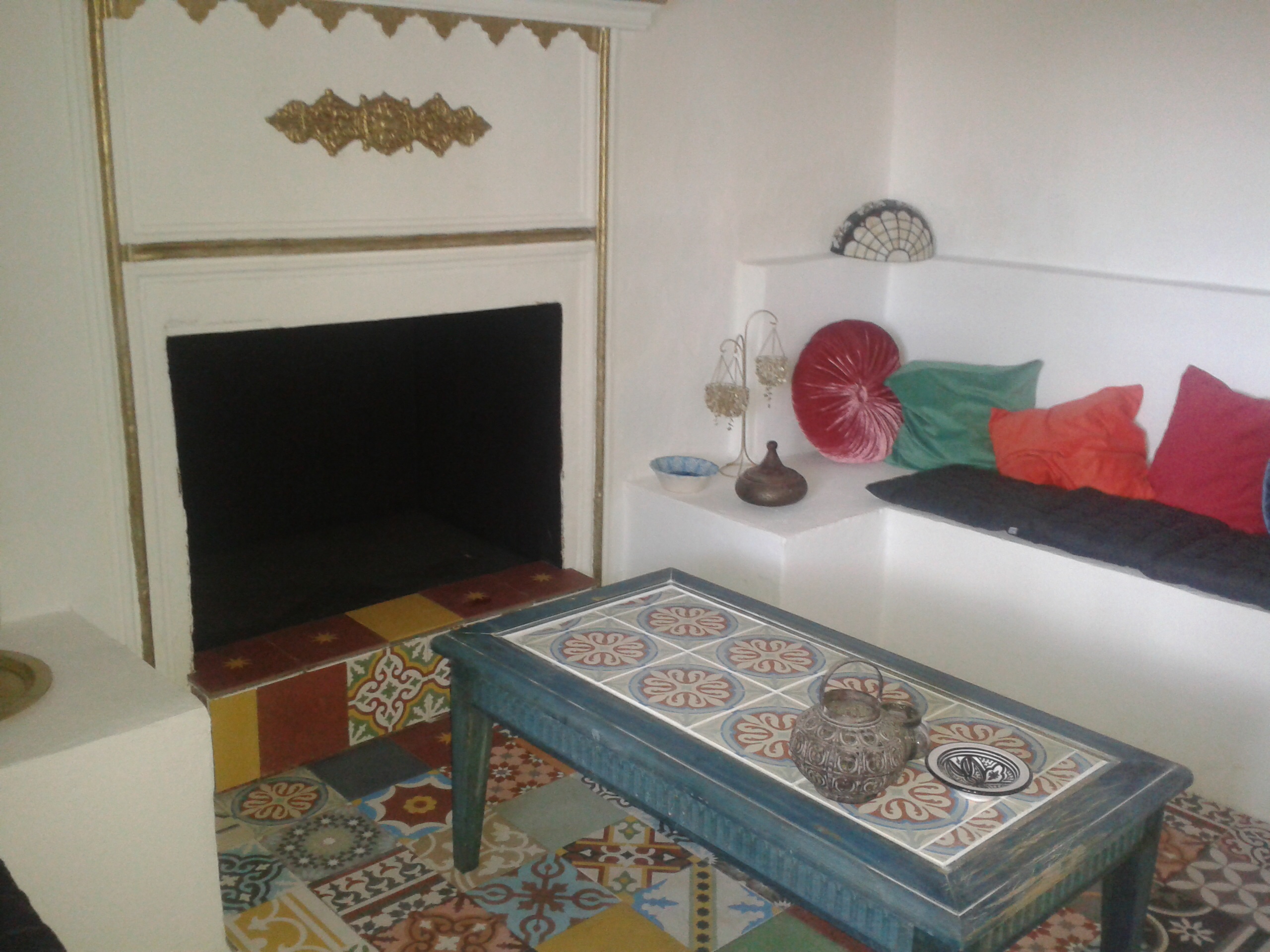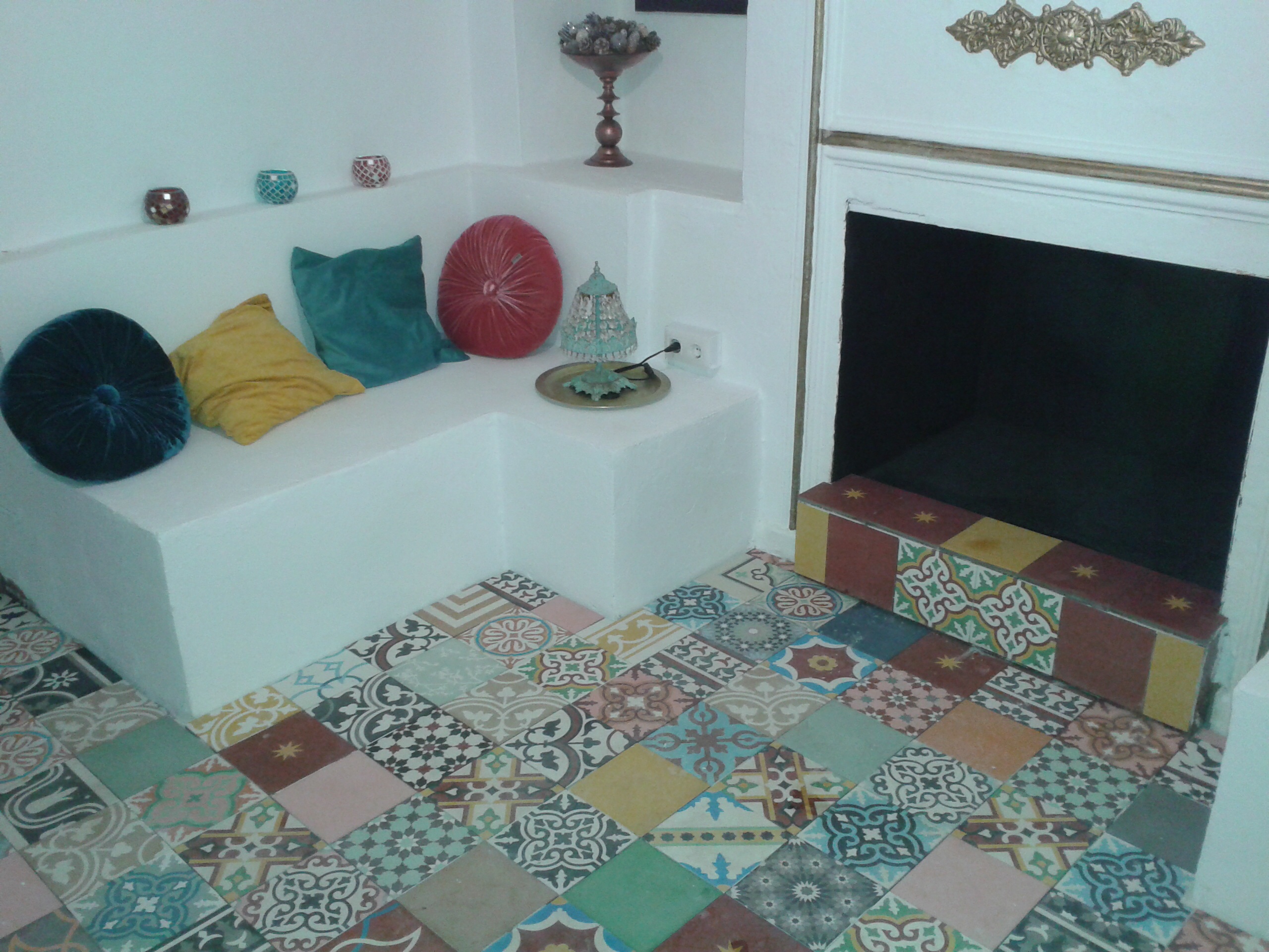 Het resultaat tot nu toe is werkelijk prachtig, wel wat bont, maar dat hoort juist vind ik. Het is een uniek kamertje, de tegels van Design tegels die Cheyenne en ik gekregen hebben voor onze hulp aan dit bedrijf staan perfect in ons Spaanse huis. Bij alle troep die de vorige eigenaar had achter gelaten in huis stond ook nog een tafeltje met een kapotte glasplaat en zand erin.