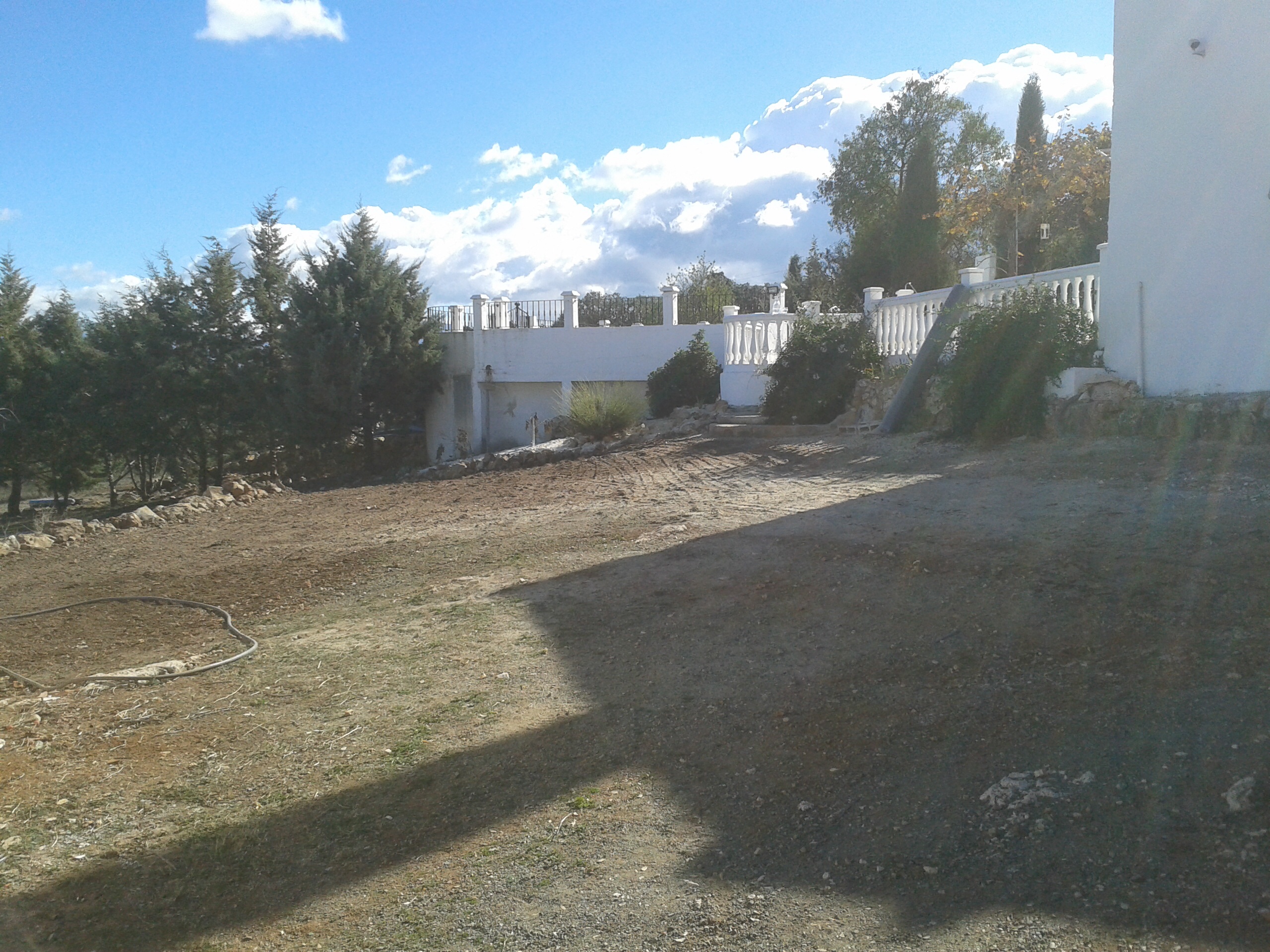 Nu de tuin met de bulldozer bewerkt is, de oude vervallen muurtjes en gebouwtjes gesloopt zijn en de oleanders verplaatst zijn, er wat andere struikjes verplaatst zijn, de grote keien langs het rijpad gelegd zijn, de kleine keitjes zoveel mogelijk aan de zijkant zijn geschoven, kan er begonnen worden met het leggen van het landbouwplastic en het storten van het grind.