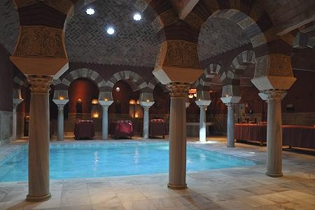 Vlak voor we naar binnen gaan wordt er iemand van onze groep ineens niet lekker. Ik besluit bij haar te blijven om aan te kijken hoe het gaat. De rest gaat naar binnen, buiten gaat het niet goed, onwijs misselijk is ze. We besluiten toch even een quickrondje door het paleis te maken, we hadden immers de kaartjes al gekocht. Maar het ging echt niet. De rest keek hun ogen uit in het prachtige paleis en als ze na een uurtje weer naar buiten komen willen ze ook nog even shoppen in het moderne gedeelte van de stad. De Spaanse Zara is favoriet, het is er net allemaal even iets goedkoper dan in Nederland. Ik besluit bij de zieke te blijven en we zoeken een hotel op, waar ze op een bank kan liggen. Zo zielig. Inmiddels is het tijd voor ons massage momentje in de hamman. Helaas gaat het met de zieke niet echt goed, de geuren van de massage olie die je al ruikt als je het gebouw in komt lopen vonden wij juist zalig maar zij werd er nog zieker van. We vroegen of we konden annuleren, helaas was dat niet mogelijk, we hadden alles al betaald en echt goedkoop is het niet, dus na flink beraad besloot iemand anders uit de groep zich heel lief op te offeren door niet mee te gaan en bij de zieke te blijven zodat wij toch met z’n vijven de warme baden in konden gaan. Maar ik kan je vertellen we voelden ons allemaal behoorlijk schuldig en niet prettig onder de omstandigheden. Je kan toch niet vrijuit genieten als je weet dat niet iedereen mee is. Maar afijn het was erg mooi in de hamman maar eigenlijk helemaal niet zo groot, een warm zwembad, twee hottubs en een stoomkamer, verder stonden er een aantal massage tafels waar we een heerlijke oliemassage kregen van 15 minuten. Verder kon je de heletijd thee pakken uit een leuk Marokkaans theepotje. De tijd vloog om, ook omdat we later naar binnen gingen. In totaal duurde het 90 minuten maar wij waren er ongeveer 80 minuten, alles ging op tijd en de volgende groep stond alweer klaar. Het was mooi, lekker maar toch had ik voor dat geld er iets meer van verwacht. Maar misschien zijn wij verwent met de Turkse hamman waar we op vakantie met zeep en schuim en een doek behandeld werden, en waar je uren kon blijven.