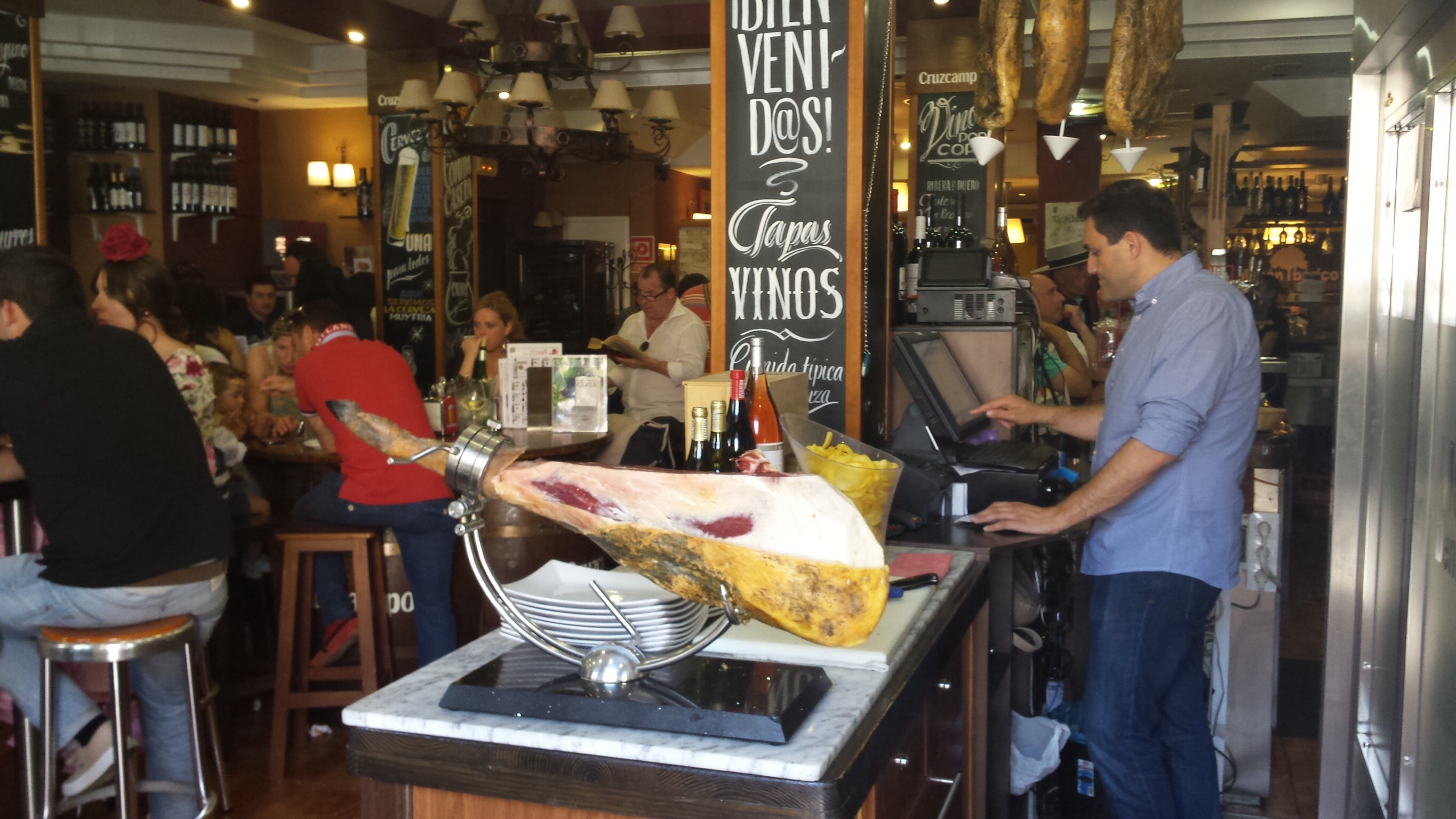 Dan maar Antequera in. Leuk stadje, er was feest, overal zagen we dames in mooie Spaanse jurken lopen. Alle pleintjes en restaurantjes zaten vol. Toen we langs restaurant Meson Iberico liepen zagen we dat het echt vol zat met locals, daar moeten we zijn dachten we en ja hoor schot in de roos. Alle tapas voor een euro en een mega grote wijnkaart. Heel gezellig.