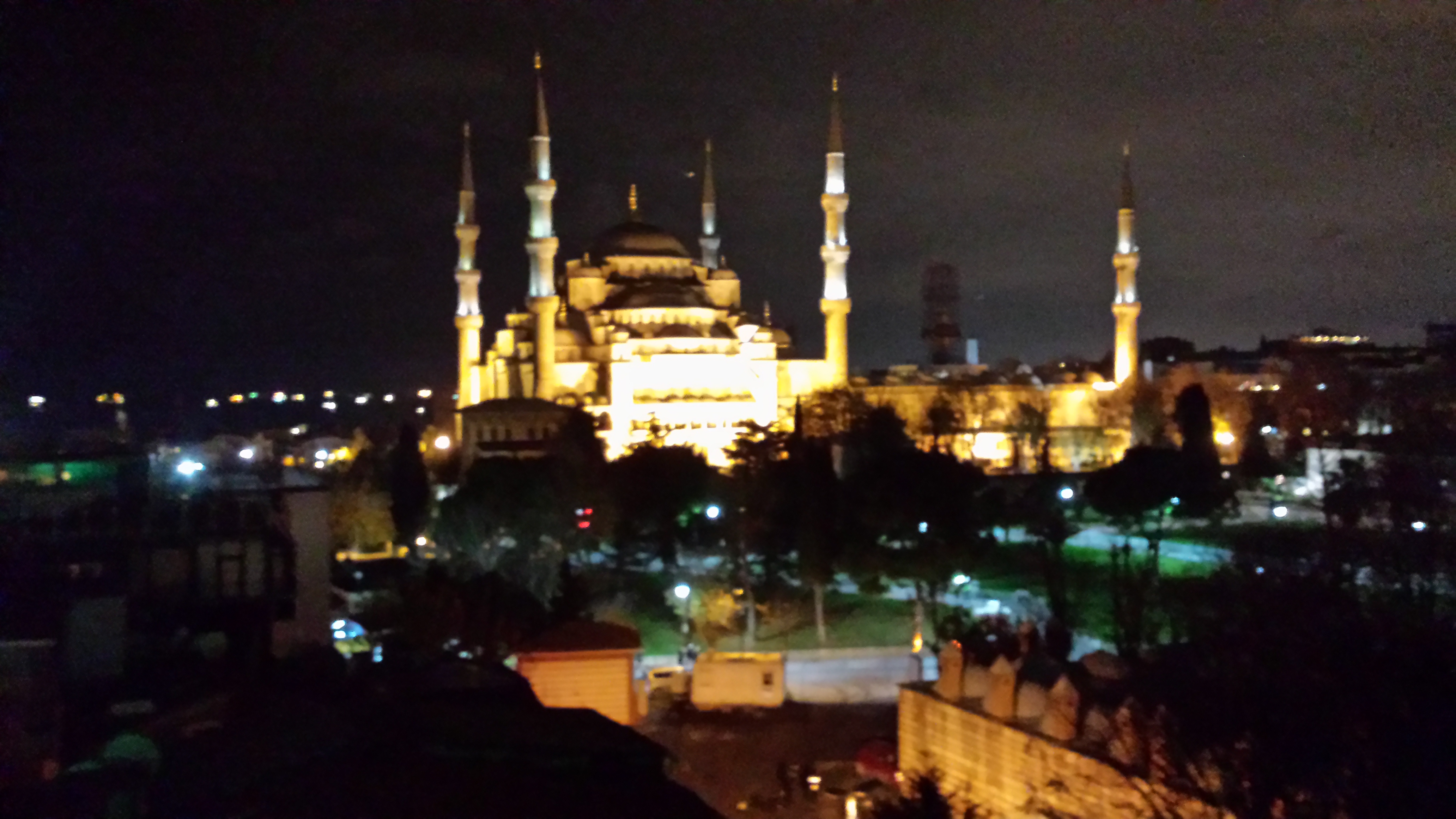 Vrijdag 11 december vertrokken we in de middag, ik had een mooie deal gevonden op Expedia. Maar wist ik veel dat er twee luchthavens zijn in Istanbul. Wij vlogen aan op Sabiha in het Aziatische gedeelte, de lowbudget luchthaven ook wel genoemd. Een rot eind van de stad af. Omdat we na een vertraging van 1.5 uur pas om half 9 aankwamen wilde ik eerst een taxi pakken, maar dat was zo duur, dat we toch maar gekozen hadden voor de bus. De witte bus met blauwe letters van Havatas staan vlak voor het station en een kaartje kost ongeveer 14 Turkse lira (4 euro pp) om naar het Taksimplein gebracht te worden, duur 1 uur. Om bij de wijk Sultanahmet te komen hadden we daar vandaan, als we met het openbaar vervoer zouden gaan, nog de metro en de tram moeten pakken maar dat vonden we toch iets te veel gevraagd daarom namen we maar een taxi daar vandaan. Natuurlijk werden we flink afgezet, normaal schijnt het rond de 20 lira te kosten maar wij moesten 40 betalen, omdat het zo druk was over de brug moest hij een andere route nemen zei hij en dat was verder rijden. We hadden op dat tijdstip geen zin in een discussie daarom lieten we het maar zo. We kwamen pas om half 11 in ons hotel Seven Hills aan.