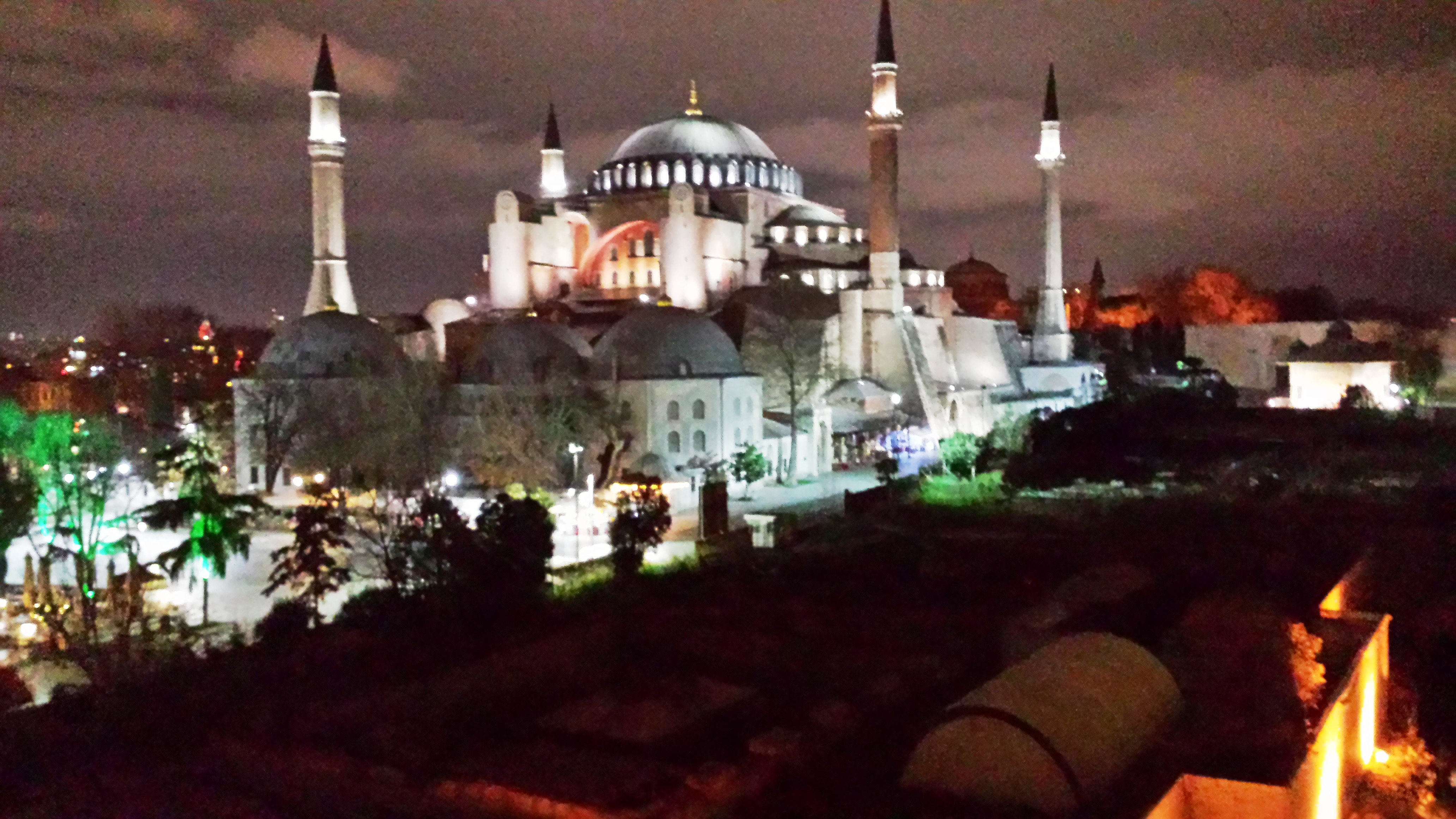 Wat een verrassing dat hotel, op de één na hoogste verdieping lag het restaurant en daar aten we nog een klein hapje met uitzicht op de twee highlights van Istanbul, de Blauwe moskee en de Haghia Sophia, we waren in een sprookje van duizend en één nacht beland.