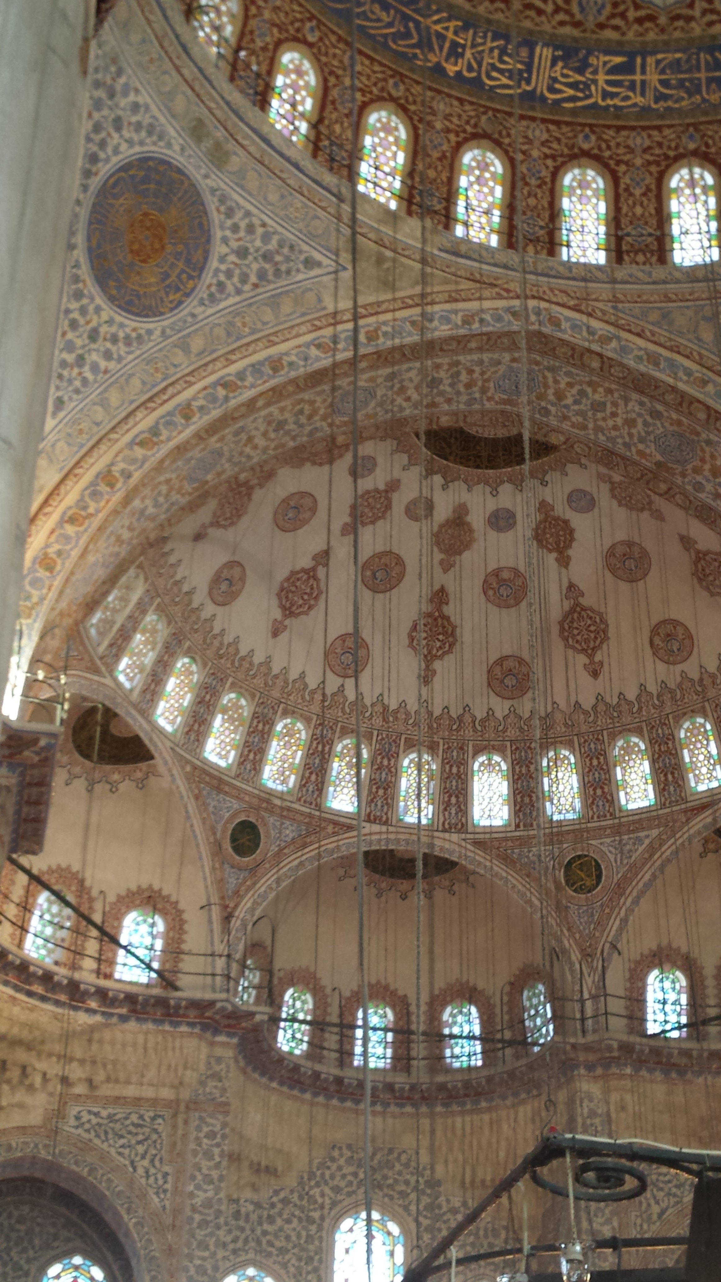 We bezochten eerst de blauwe moskee. Gebouwd in de zeventiende eeuw, Sultan Ahmet I wilde een moskee bouwen die mooier en groter was dan de naastgelegen Hagia Sophia. Hij is niet blauw maar de centrale koepel die 33 meter doorsnede heeft is gedecoreerd met mooie tegeltjes waarbij het blauw eruit springt. De moskee heeft 6 minaretten en is open voor iedereen maar de vrouwen moeten wel hun hoofd bedekken en je moet je schoenen uit.