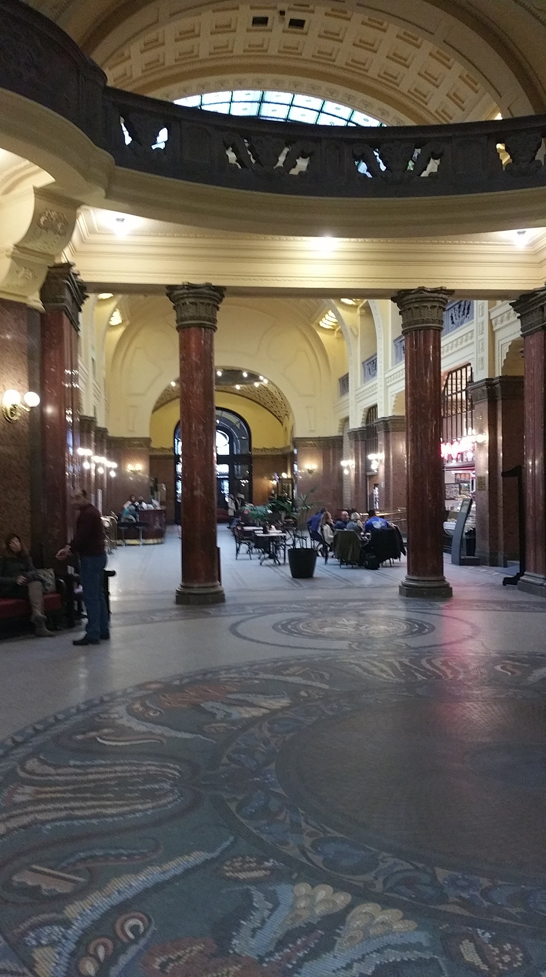 We liepen naar binnen bij het Gellértbad, het oudste golfslagbad van Centraal Europa, het ziet er statig uit binnen met veel zuilen, beelden en mozaïek werken. Het 38 graden hete water in de baden is rijk aan magnesium en zwavelchloride en fluoride.20160125_144956