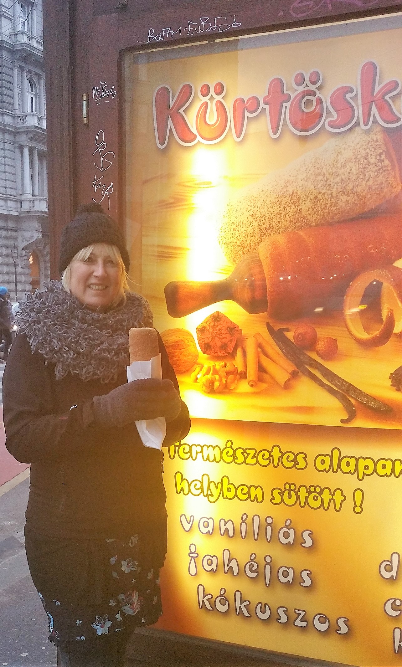 We aten nog een apart zoetbroodje, Kürtós kalács, het deeg wordt om een stok gerold en wordt draaiend in een oventje een paar minuten verwarmd, daarna in een zoet mengsel naar keuze gerold, ik had gekozen voor kaneel en Lesley voor vanille, de buitenkant van het ‘broodje’ is hard en de holle binnenkant zacht, het smaakt echt super lekker. Op vele hoeken van de straat zie je een klein hokje staan waar ze deze broodkoek in klaarmaken, je eet het warm en als het koudweer is smaakt dat nog lekkerder en het kost maar €1.