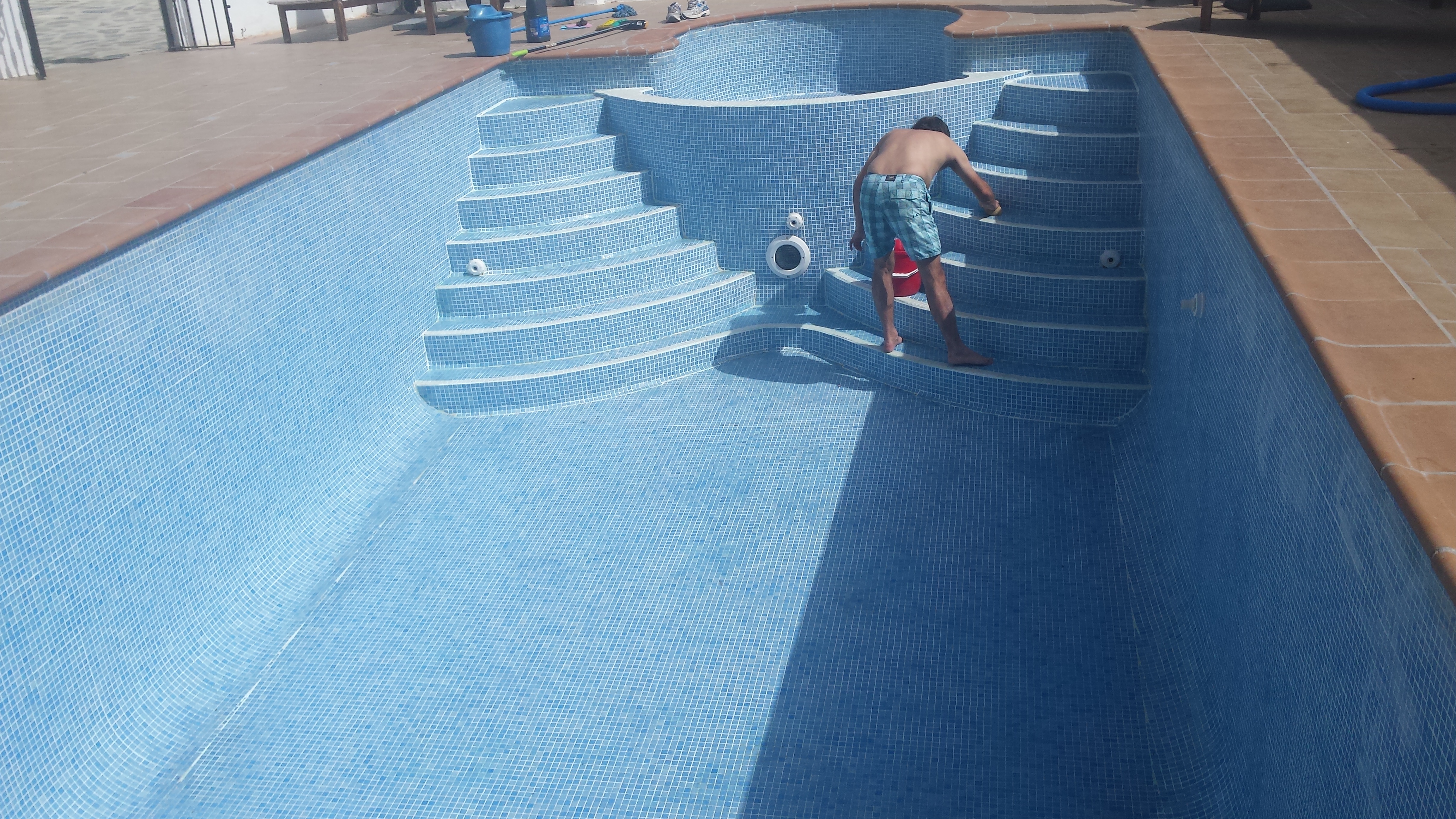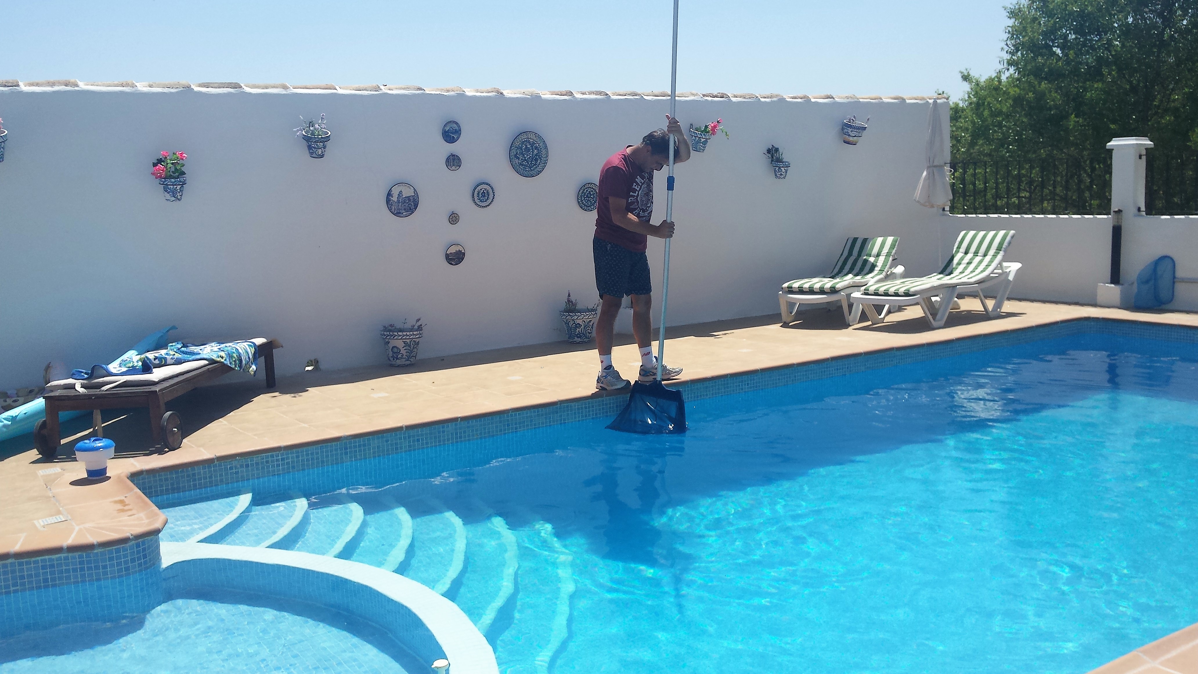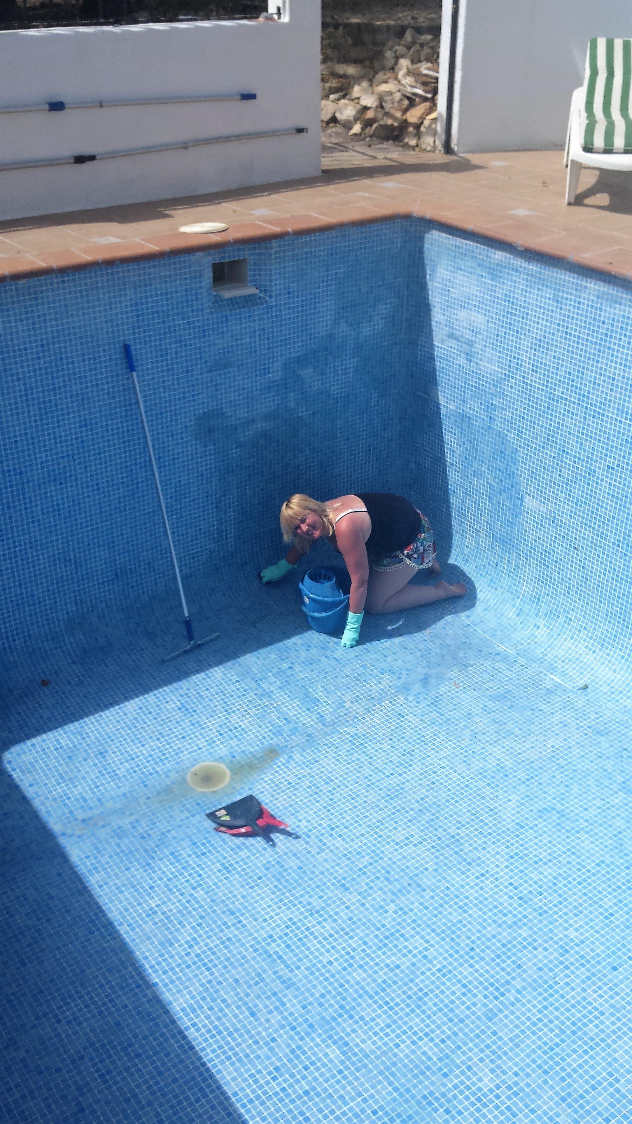 Het viel niet mee om het zwembad schoon te schrobben in de kokende zon. Ik had liever heerlijk gezwommen in ons diepe zwembad voor een beetje verkoeling.