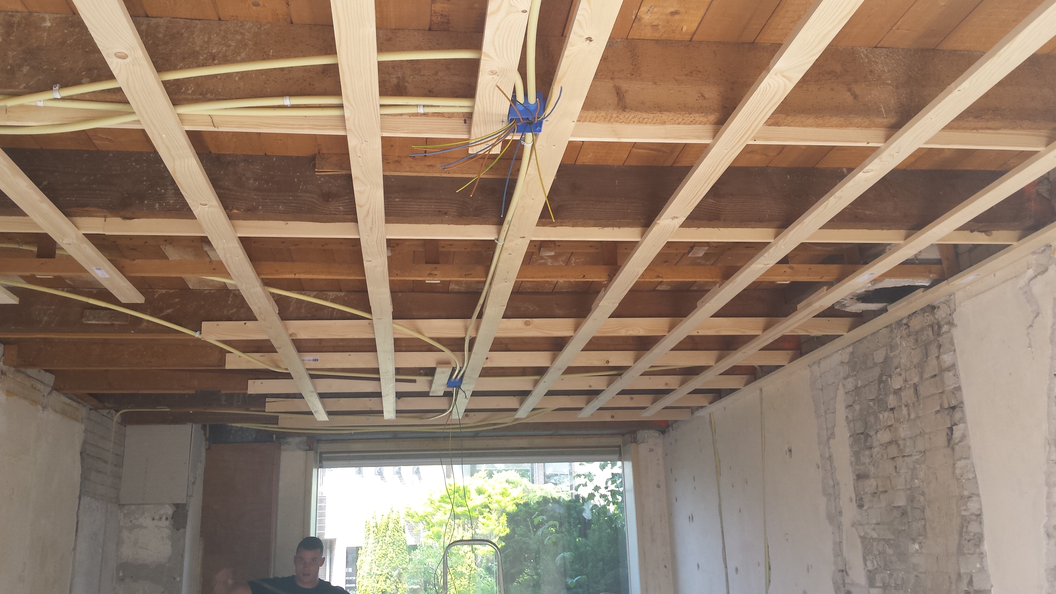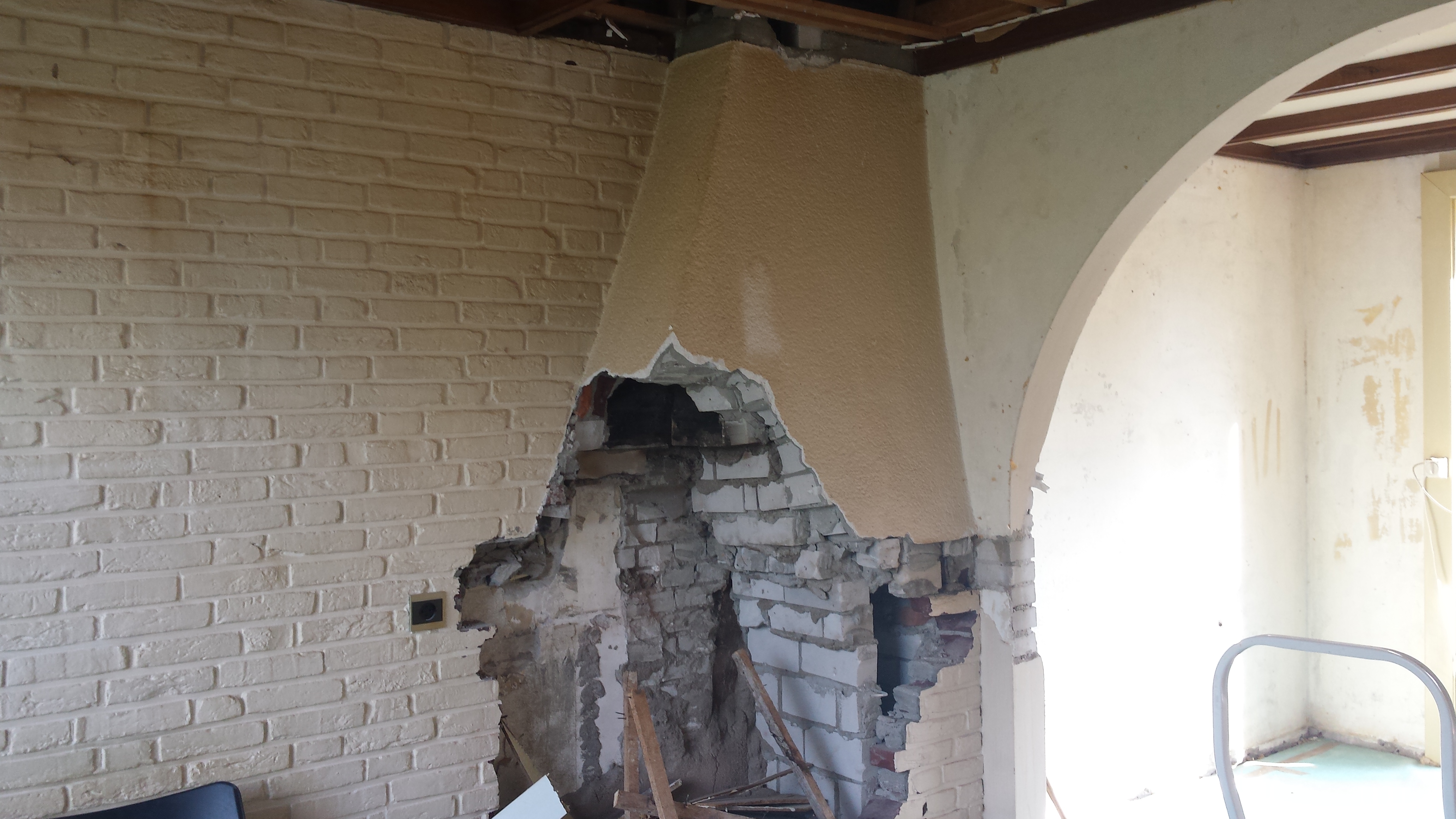 De keuken eruit, de plafonds, de openhaard, muurtjes uitgebroken, ingebouwde kasten weggehaald behang er afgestoomd en de vloerbedekking eruit. Wat een klus.