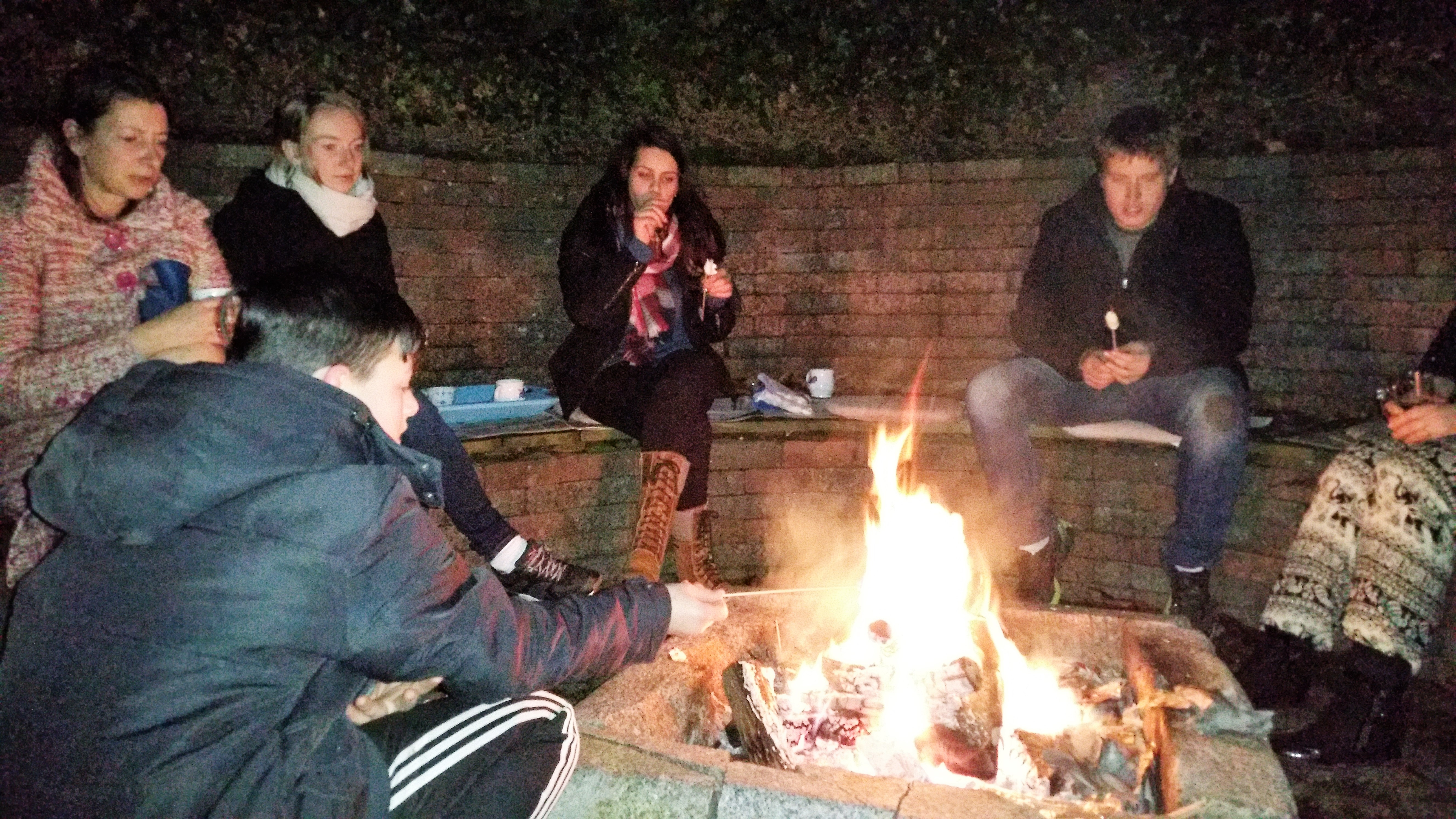 Om 4 uur wordt het al donker in Denemarken. De zitkuil werd blad vrijgemaakt en het hout werd in het midden neergelegd en het vuurtje werd aangestoken. Het was onder nul, maar met een gløgg en thee met marshmallows erbij hadden we dat helemaal niet in de gaten. De sterren schenen volop en met de spannende verhalen erbij was dit wederom een topavond.