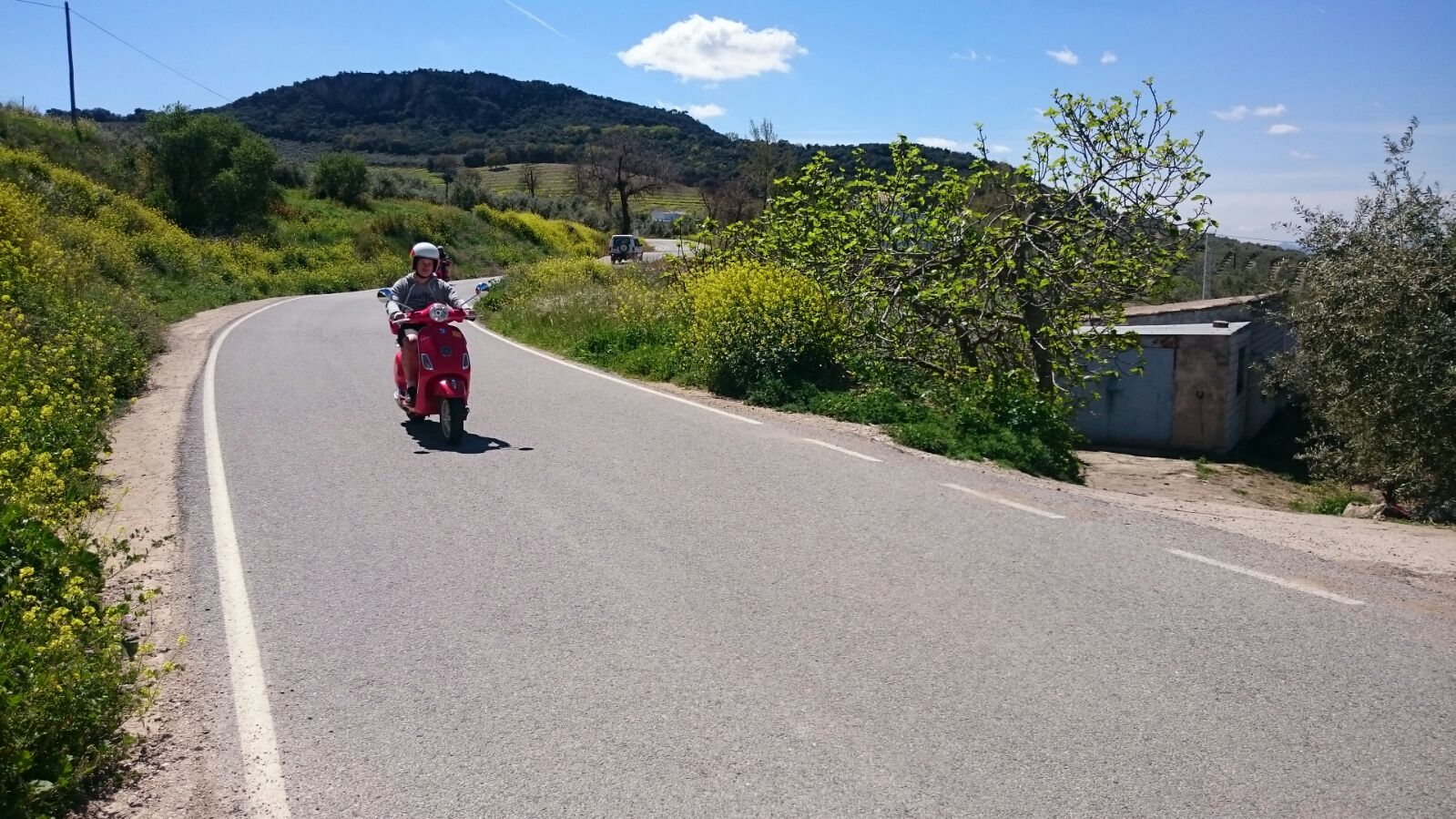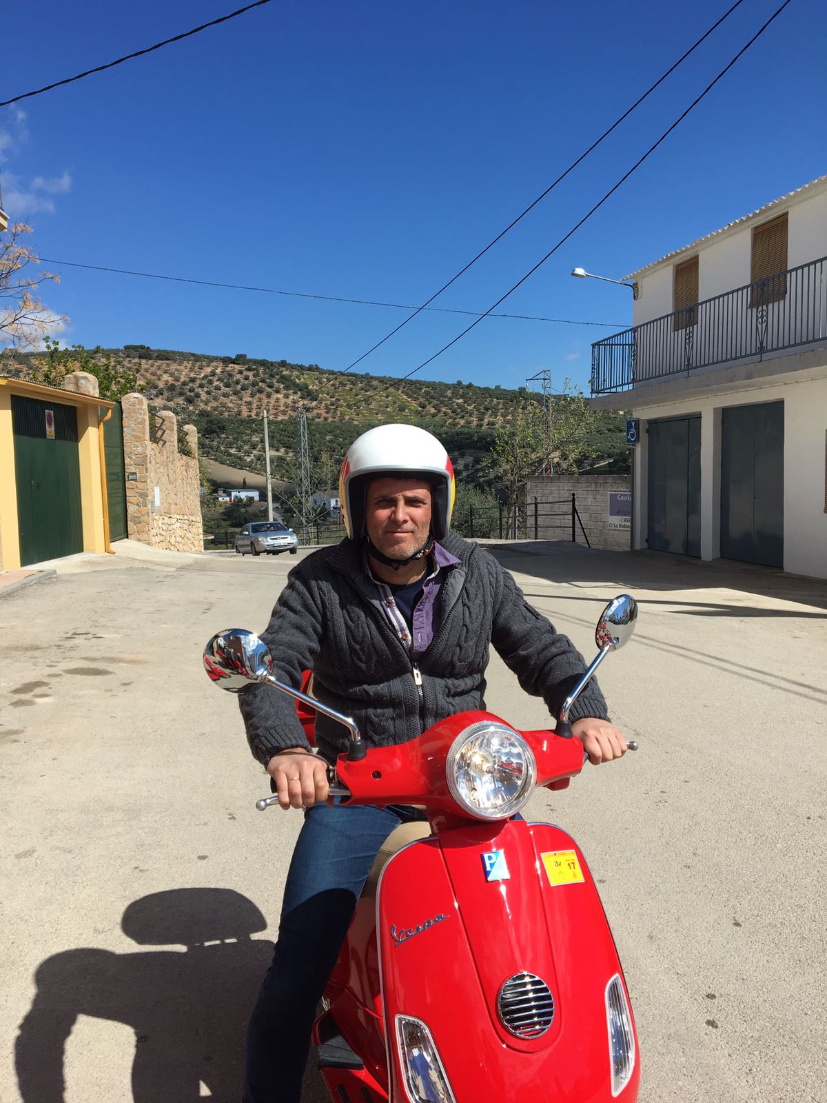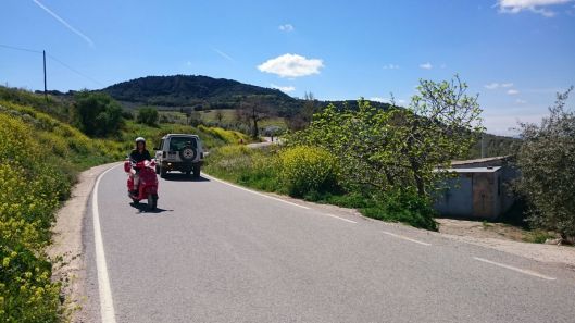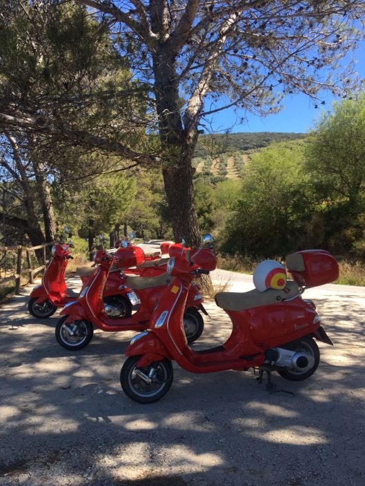 Vol goede moed en een dossis goede spanning gingen op weg, het was prachtig onderweg, de mensen die we onderweg tegen kwamen zwaaiden bijna allemaal, dat is het leuke van het platteland. Het zal ook best een leuk gezicht zijn geweest 5 van die knalrode Vespa scooters achter elkaar aanrijdend. We reden allemaal erg voorzichtig, toch hebben we niet kunnen voorkomen dat 3 van ons in het dorpje op de gladde steentjes onderuit gingen. Het zijn allemaal smalle straatjes die ook nog eens hellend zijn. Mijn advies is dus parkeer je scooter aan het begin van het dorp en ga te voet het dorpje verkennen. Met een aantal goede blauwe plekken en wat schaafwonden vertrokken we na de lunch weer vanuit het schattige dorpje Montefrio die bekend is om zijn pittoreke aangezicht en en zijn ronde koepel kerk, om onze route te vervolgen.