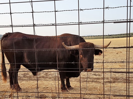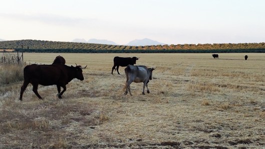 Een dag nadat buurman alle balen van het land af had, hoorden we tegen de avond ineens een kabaal. Ik zei tegen Lesley, het lijkt wel of ik ezels hoor. Maar wat bleek de koeien werden het land opgelaten en zij waren zo blij dat ze de raarste geluiden produceerde. We liepen naar het hek toe en zagen een stuk of 50 donkerbruine koeien, kalfjes en stieren heel blij heen en weer lopen en ze waren flink aan het loeien naar elkaar met af en toe wat gebalk achtige kreten er tussen door. Werkelijk prachtig om te zien en te horen. Omdat het een groot stuk land is hebben wij de verrekijker gepakt om alles wat dichterbij te halen. Ik werd hier zo blij van.