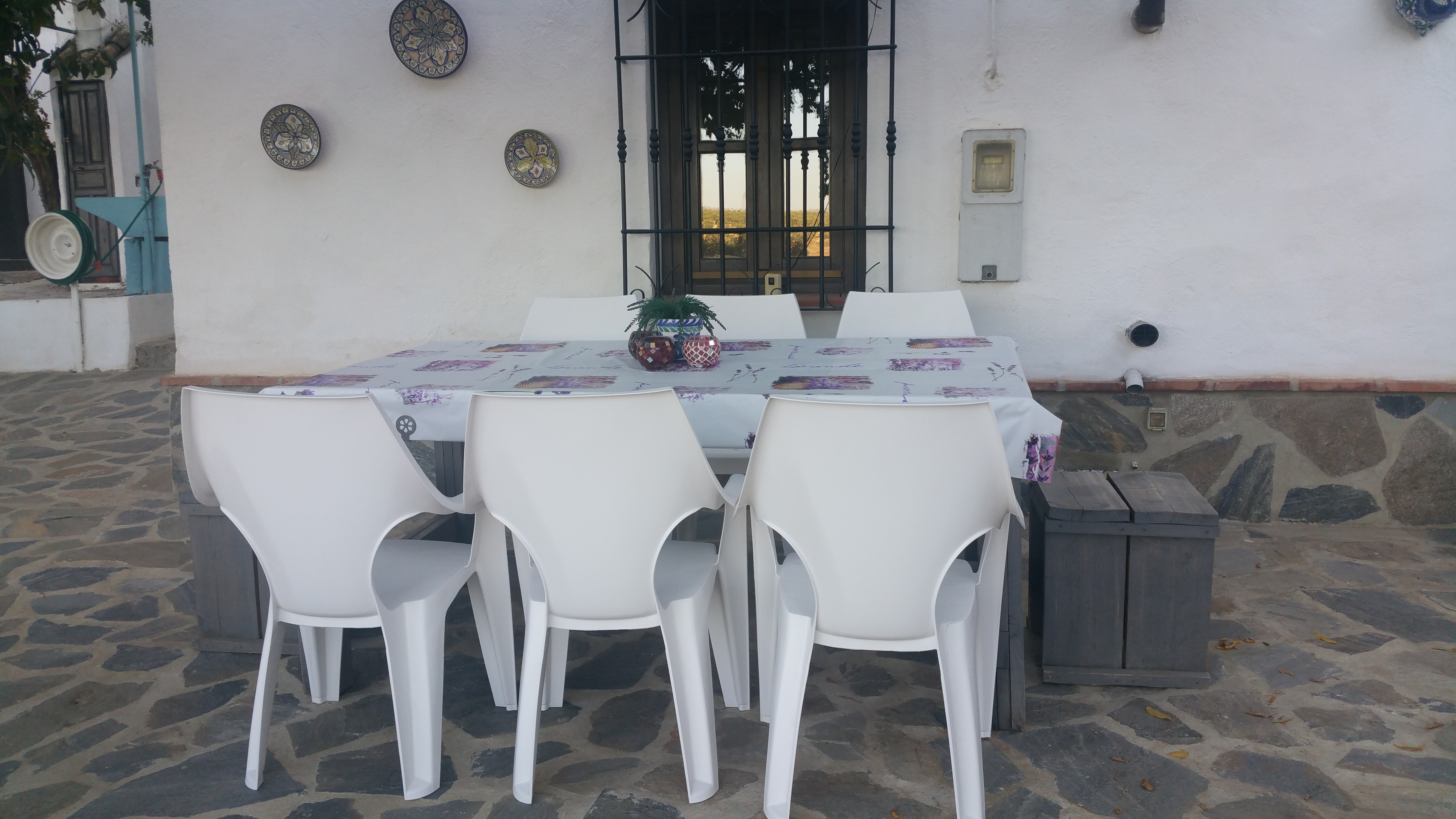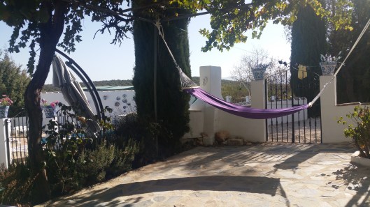 Ik ben heel blij met mijn nieuwe stoeltjes, mijn nieuwe paarse hangmat en mooie lavendel tafelkleed.