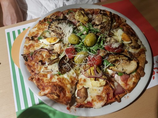 Toen we kaart kregen hadden we keuze stress. Er stonden tientallen verschillende soorten pizza’s op. Te krijgen in 4 varianten, klein, medium, groot en extra groot. Verder stonden er nog tientallen pasta gerechten en ook nog gewoon vlees en vis stonden er op het menu. Zullen we de medium pizza nemen en dan beginnen met een voorgerecht zeiden we eerst tegen elkaar. Maar we dachten toen laten we eerst maar eens kijken wat we krijgen, we kunnen altijd nog iets extra’s bestellen.