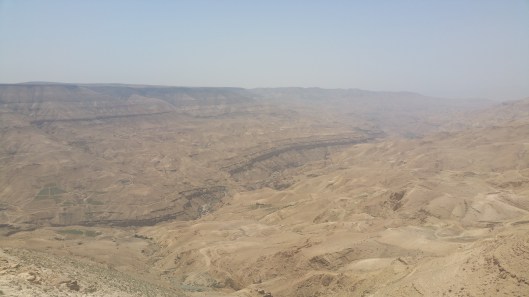 Gekscherend noemde Ferdy het landschap wat we zagen de Grand Canyon van Jordanië. Er was zelfs een soort hooverdam. We keken uit op de kloof van Wadi Mujib. De rivier mondt uit in de dode zee maar staat voor een groot deel van het jaar droog. De dam vangt aan de ene kant het water op en voorziet daarmee de dorpen en steden van water. De kloof is onstaan door het verschuiven van de aardplaten tussen twee continenten. Spectaculair om te zien.